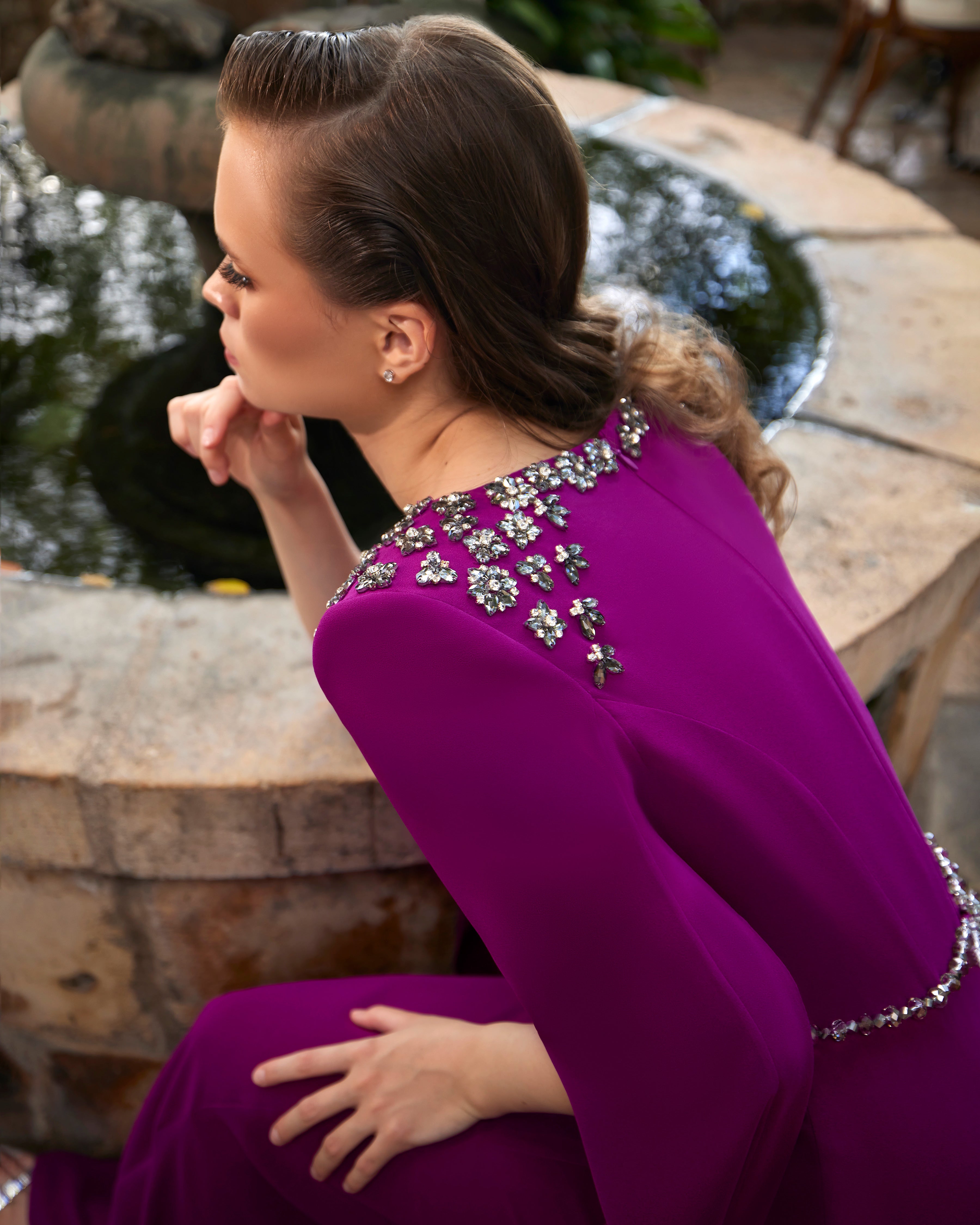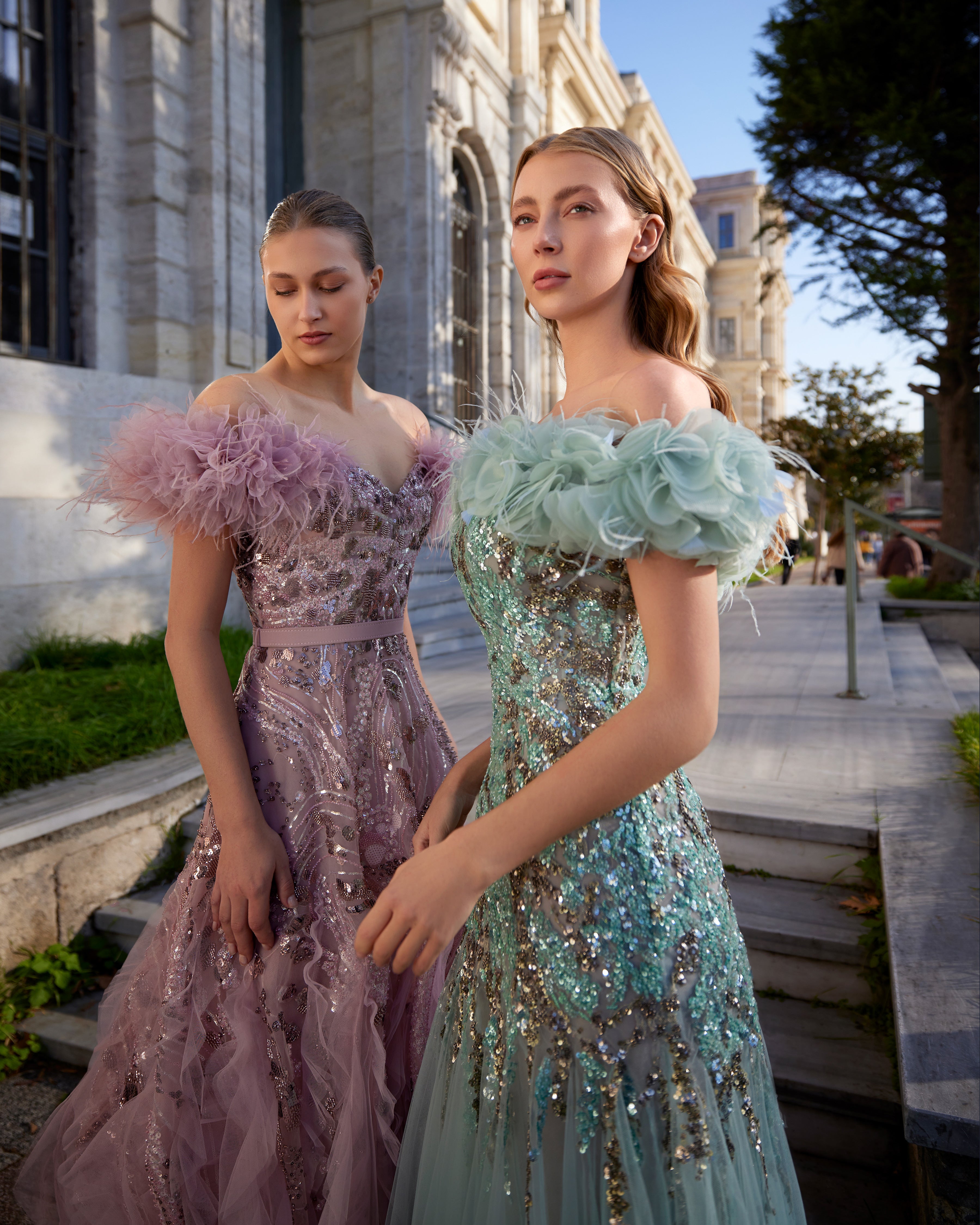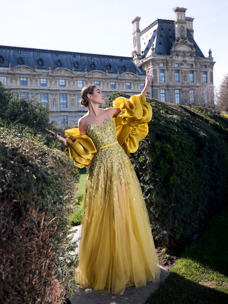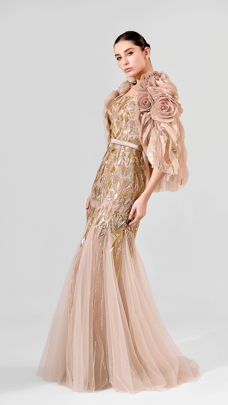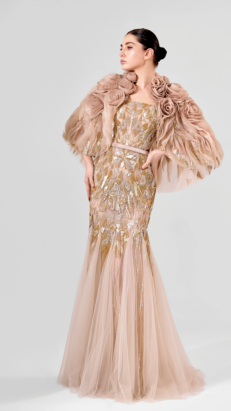 Embroidered Mikado Gown with Ruffled Organza Sleeves | 909