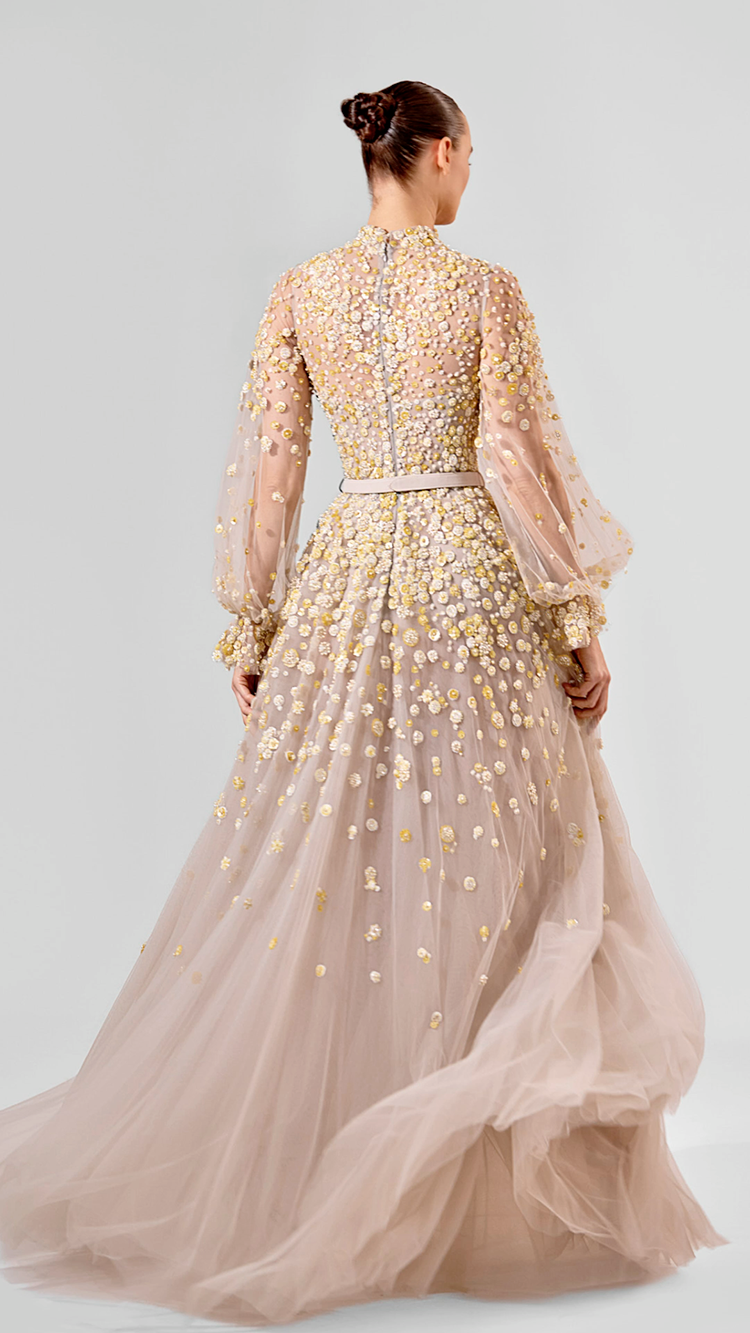 Long-Sleeve Tulle Gown with Floral Embroidery | 933