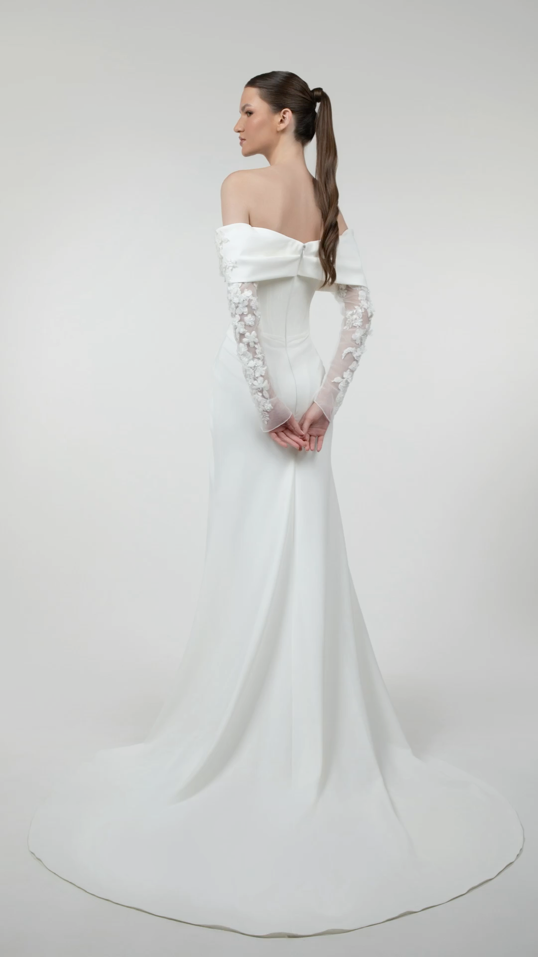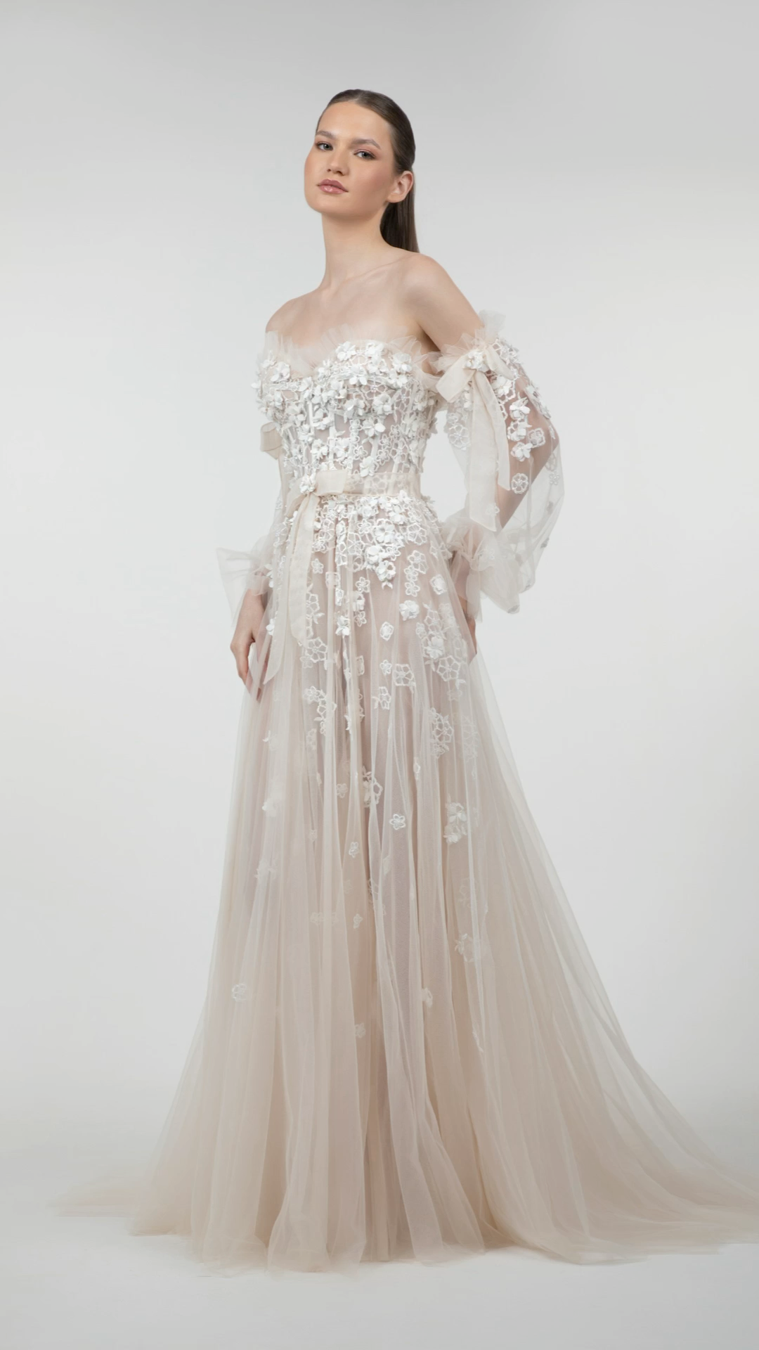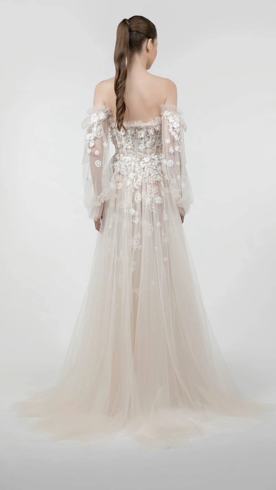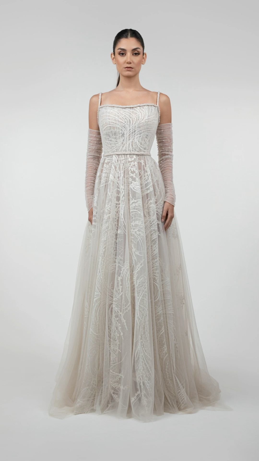 Off-Shoulder Embroidered Tulle Gown with Detachable Sleeves