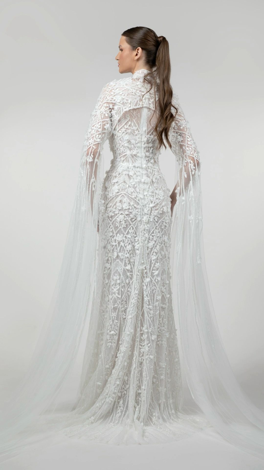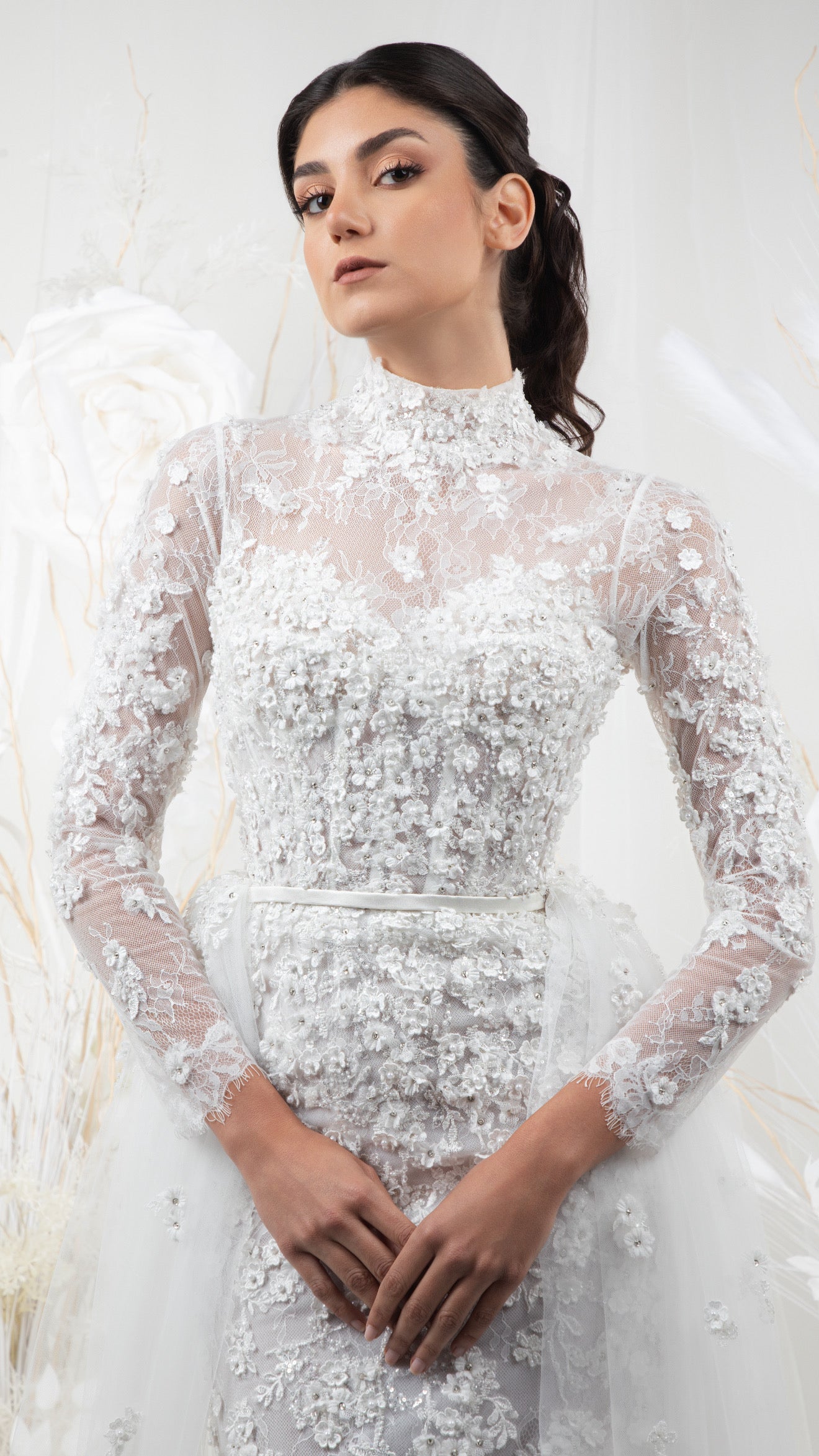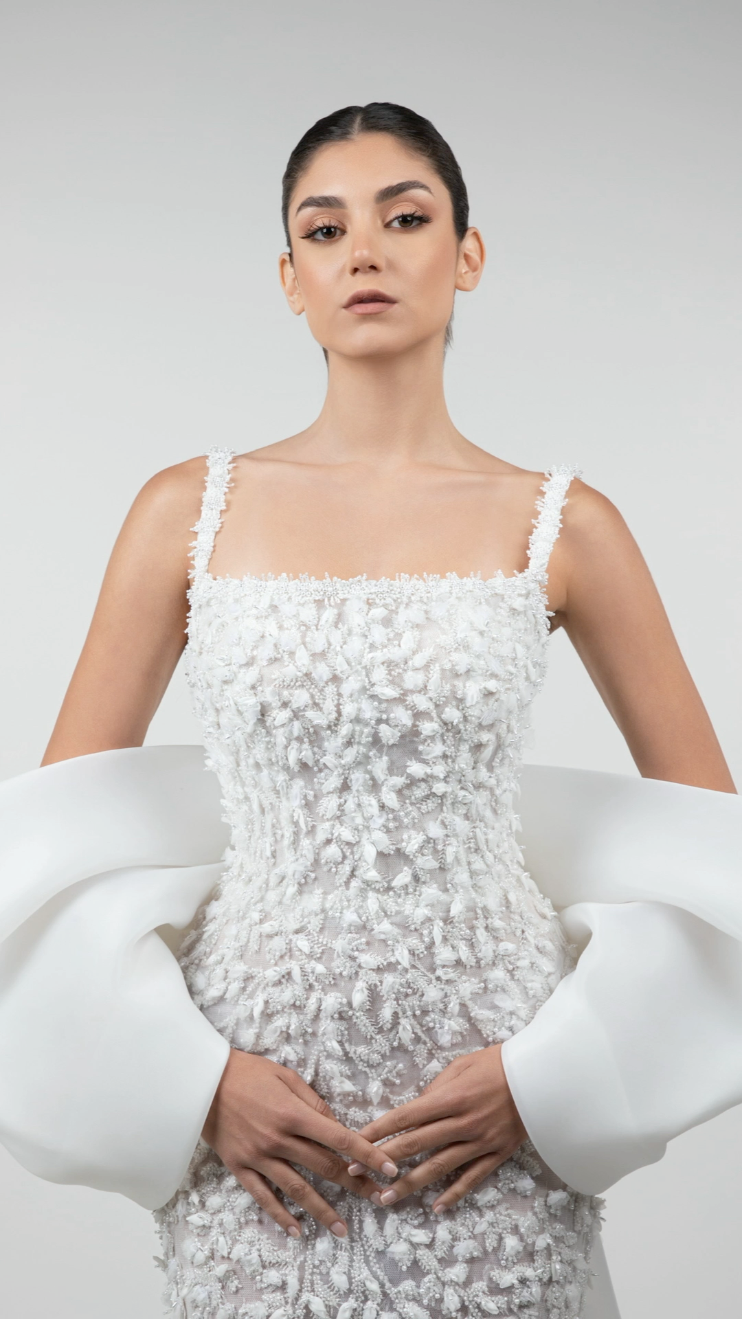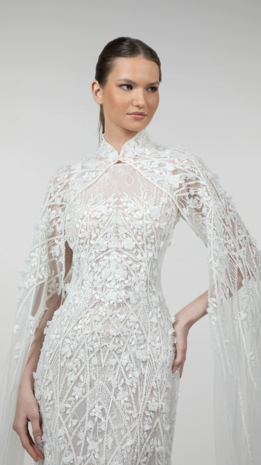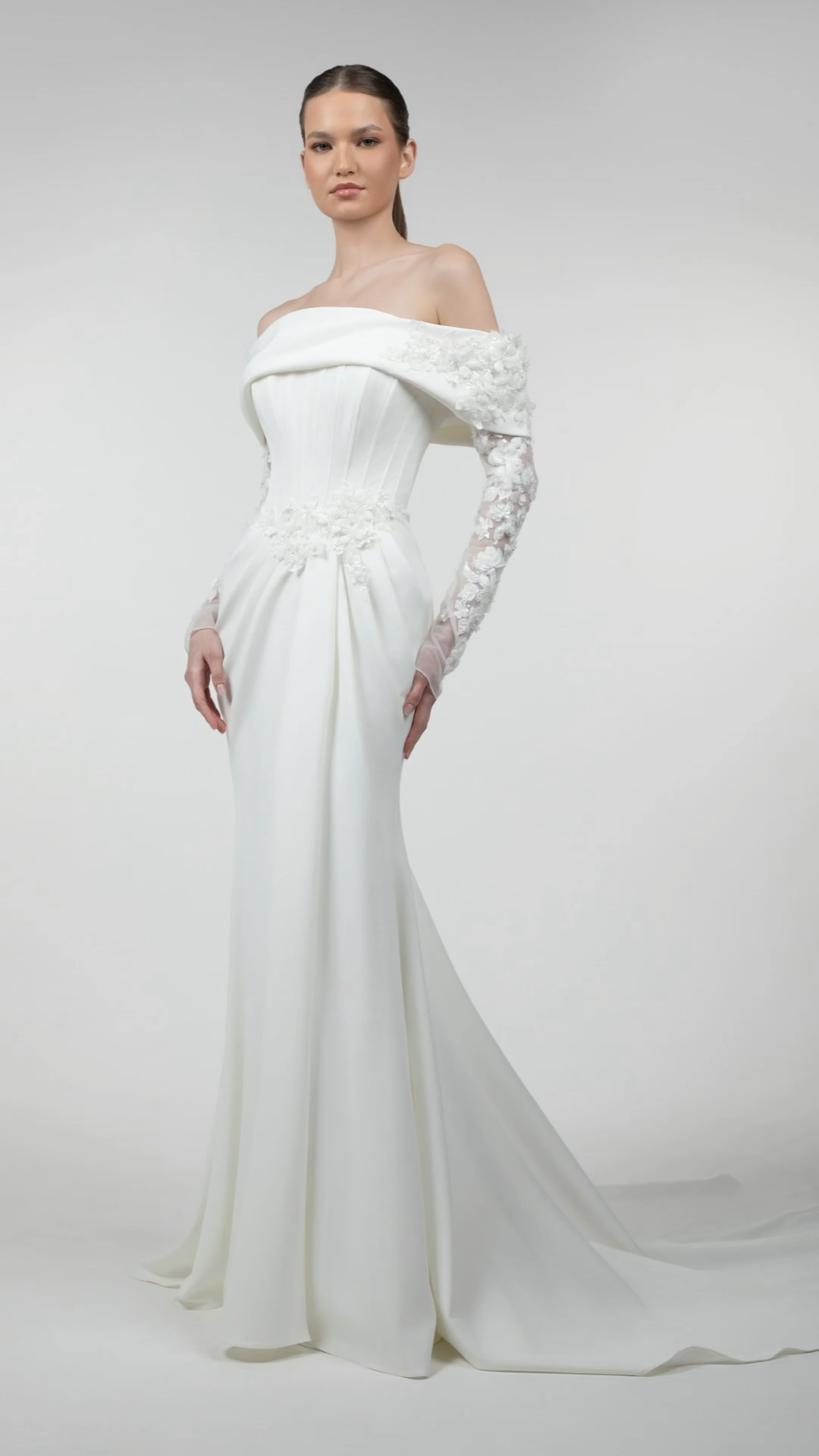 Off-Shoulder Embroidered Tulle Gown with Detachable Sleeves