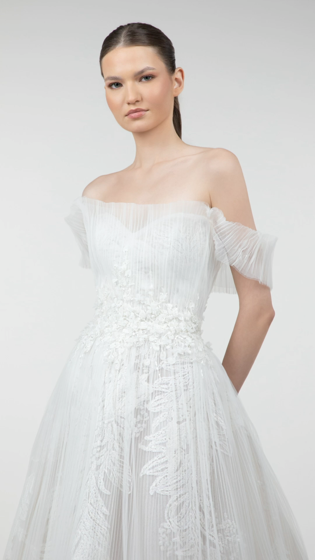 Off-Shoulder A-Line Gown with Pleated Tulle