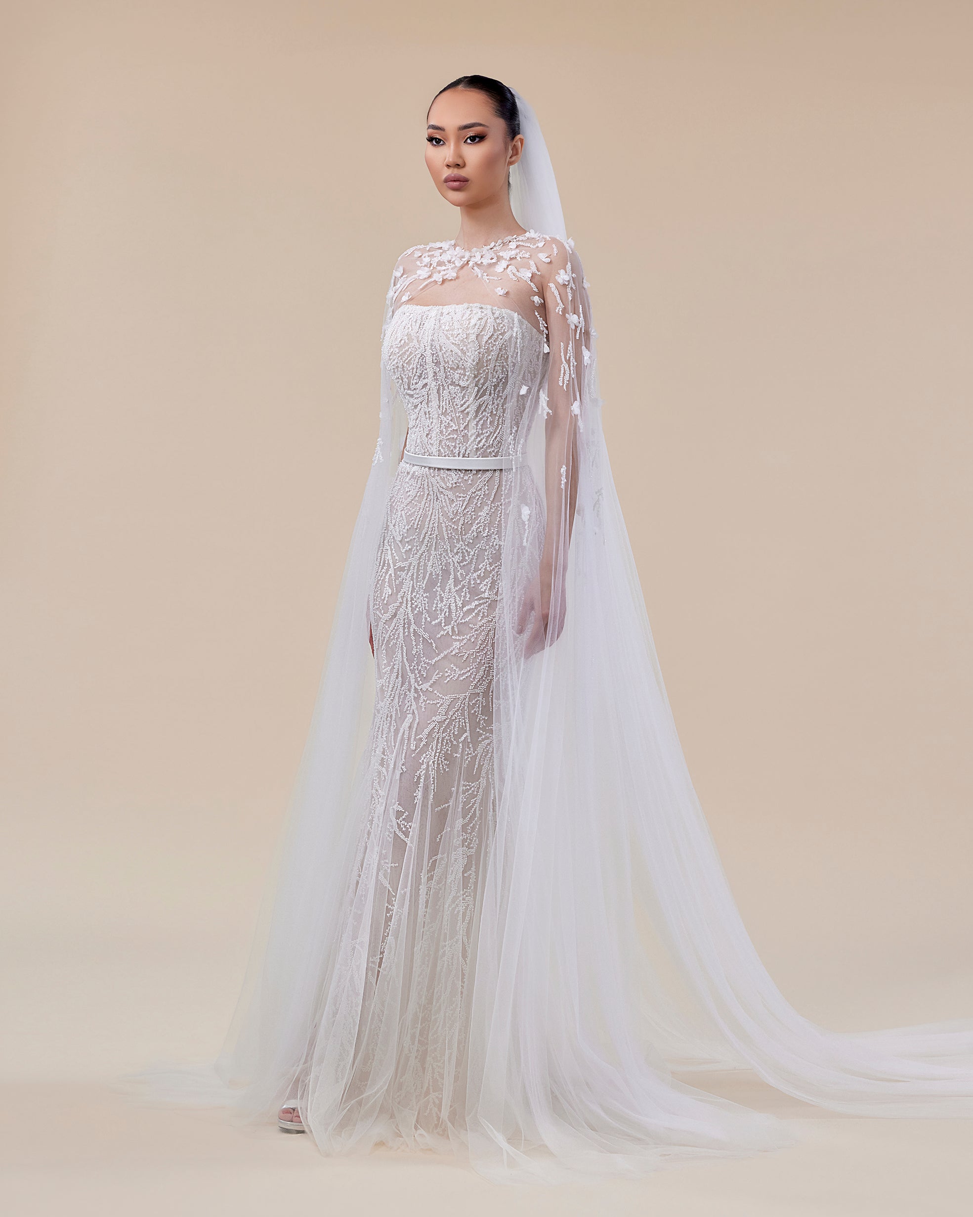 Fully Embroidered Tulle Bridal Gown with 3D Floral Cape
