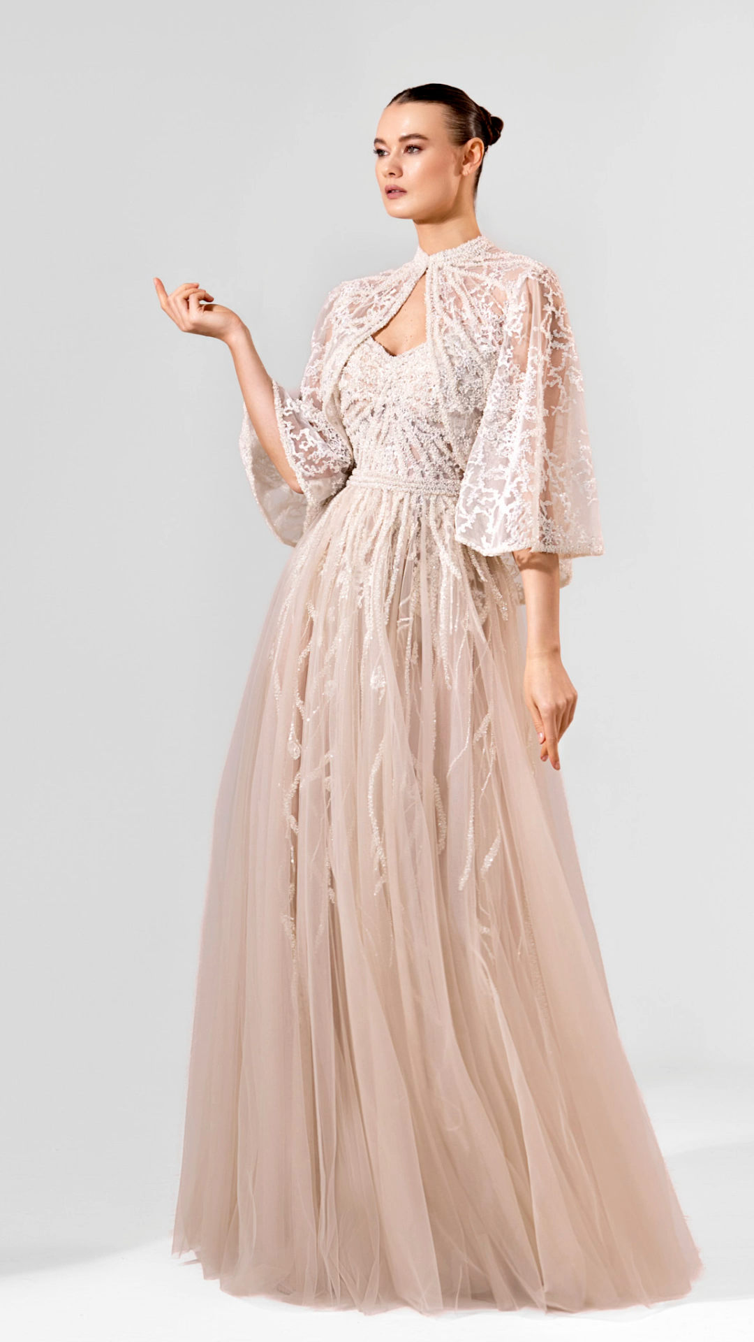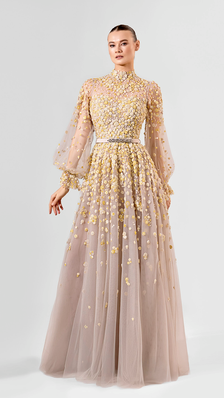 Long-Sleeve Tulle Gown with Floral Embroidery | 933