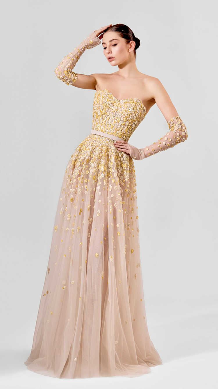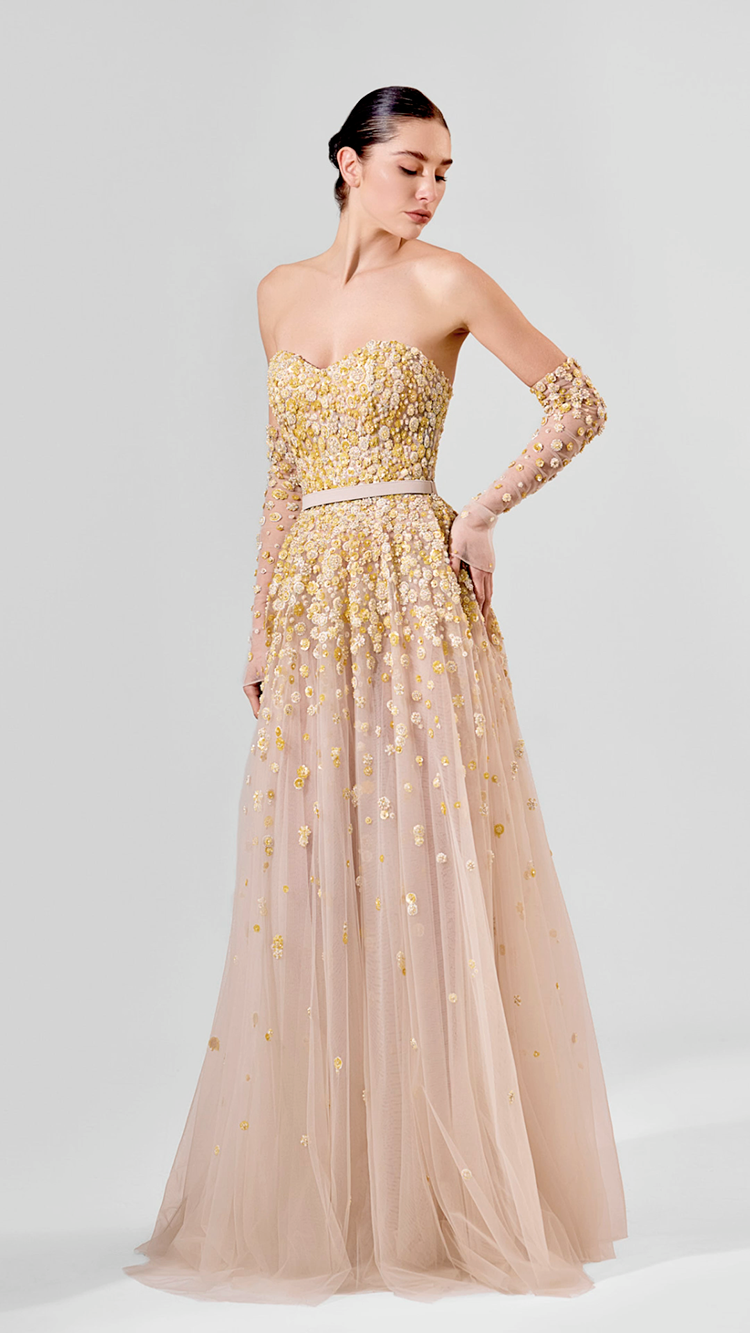 Sweetheart strapless embroidered tule dress with embroidered gloves |929