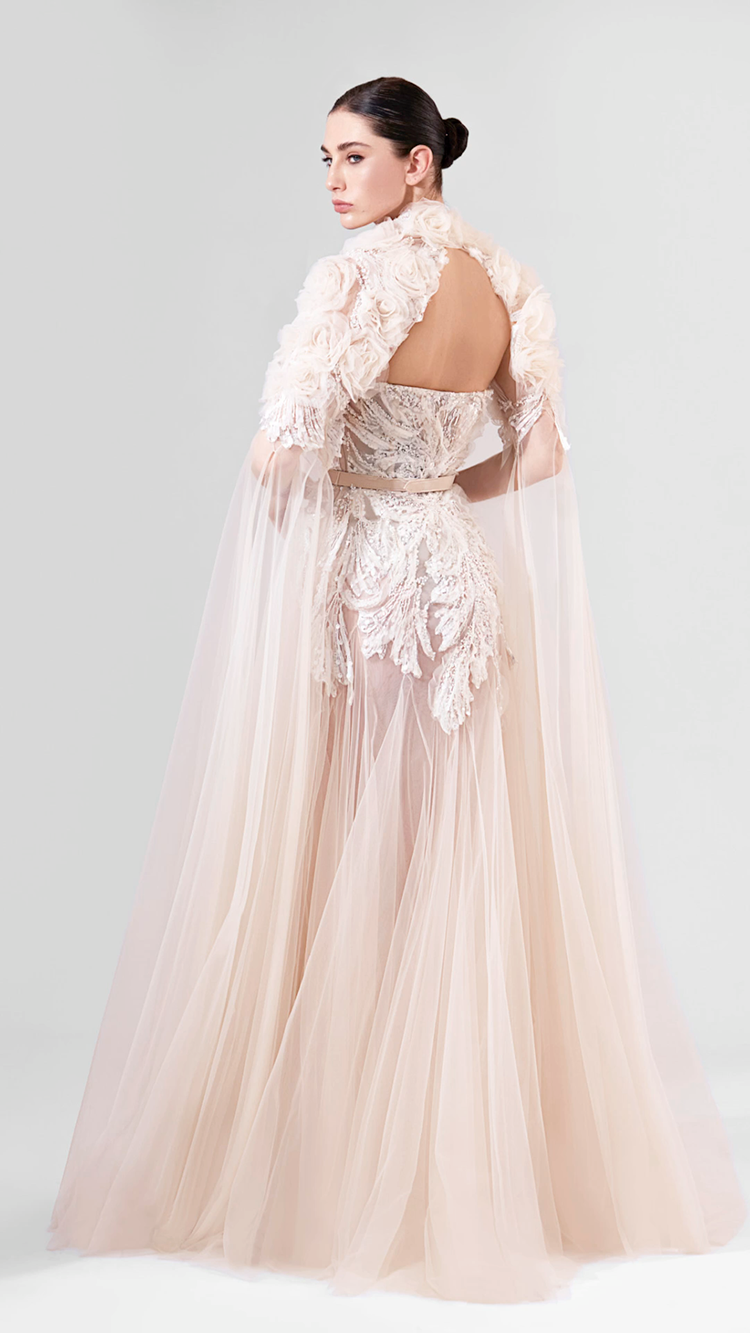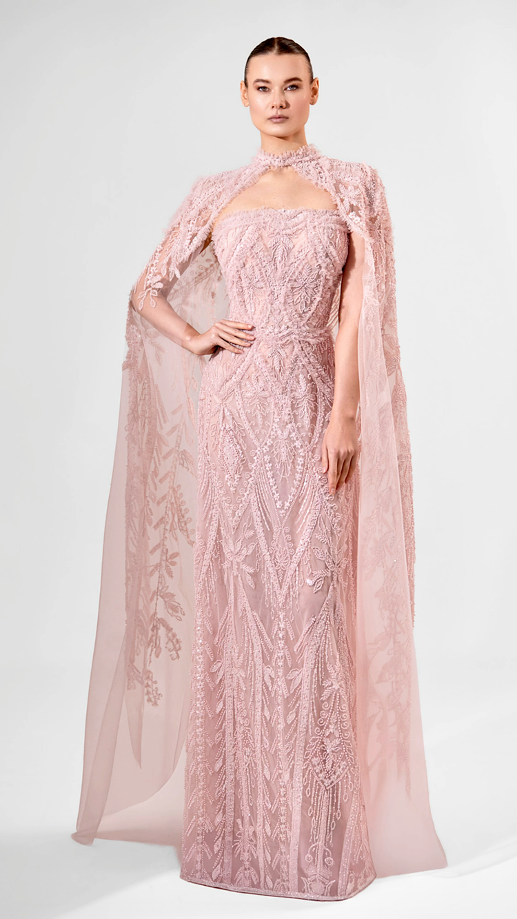 Strapless Fully Embroidered Tulle Gown with Cape | 991