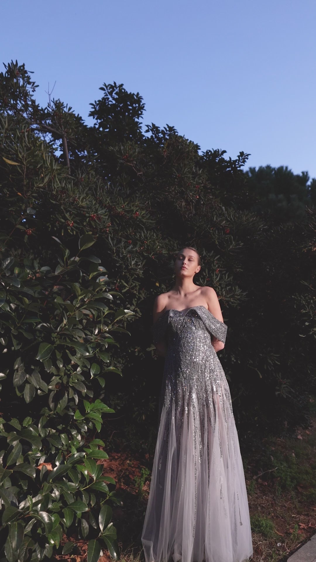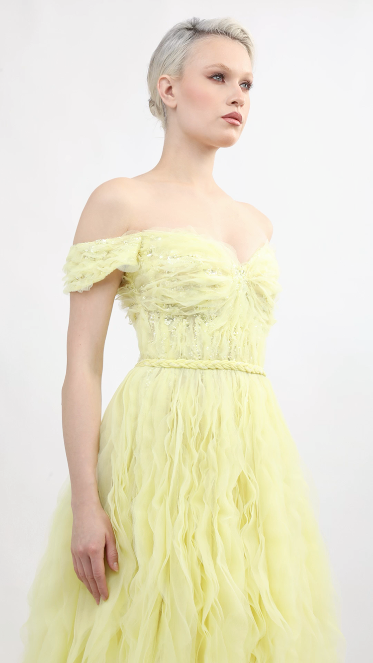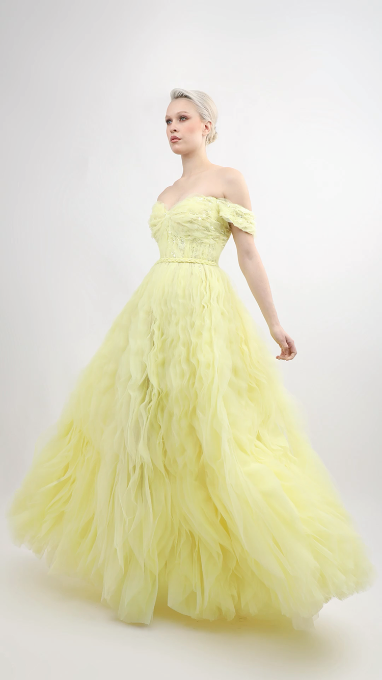 Off-Shoulder Tulle Gown with Hand Embroidery | 999