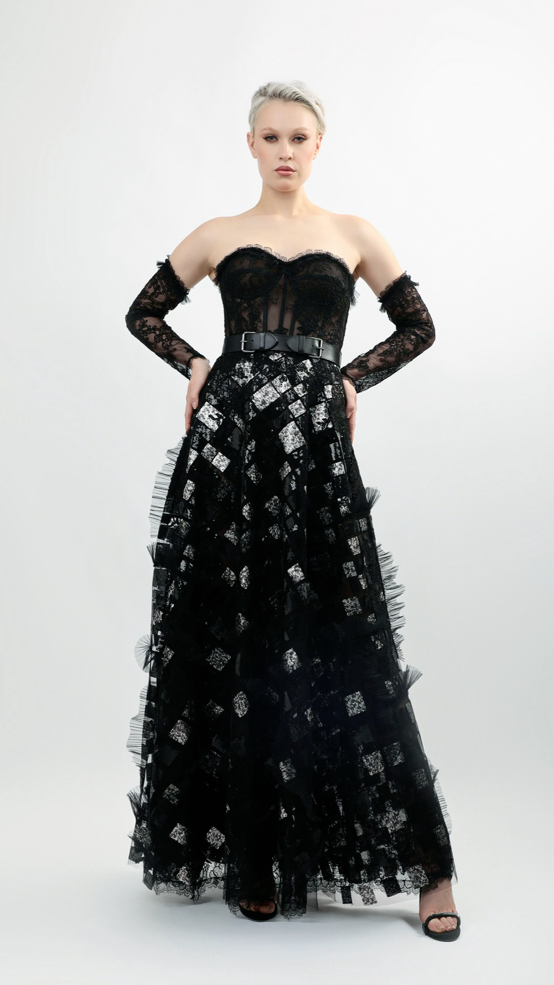 Three-Piece Crepe Ensemble with Laser-Cut Floral Corset