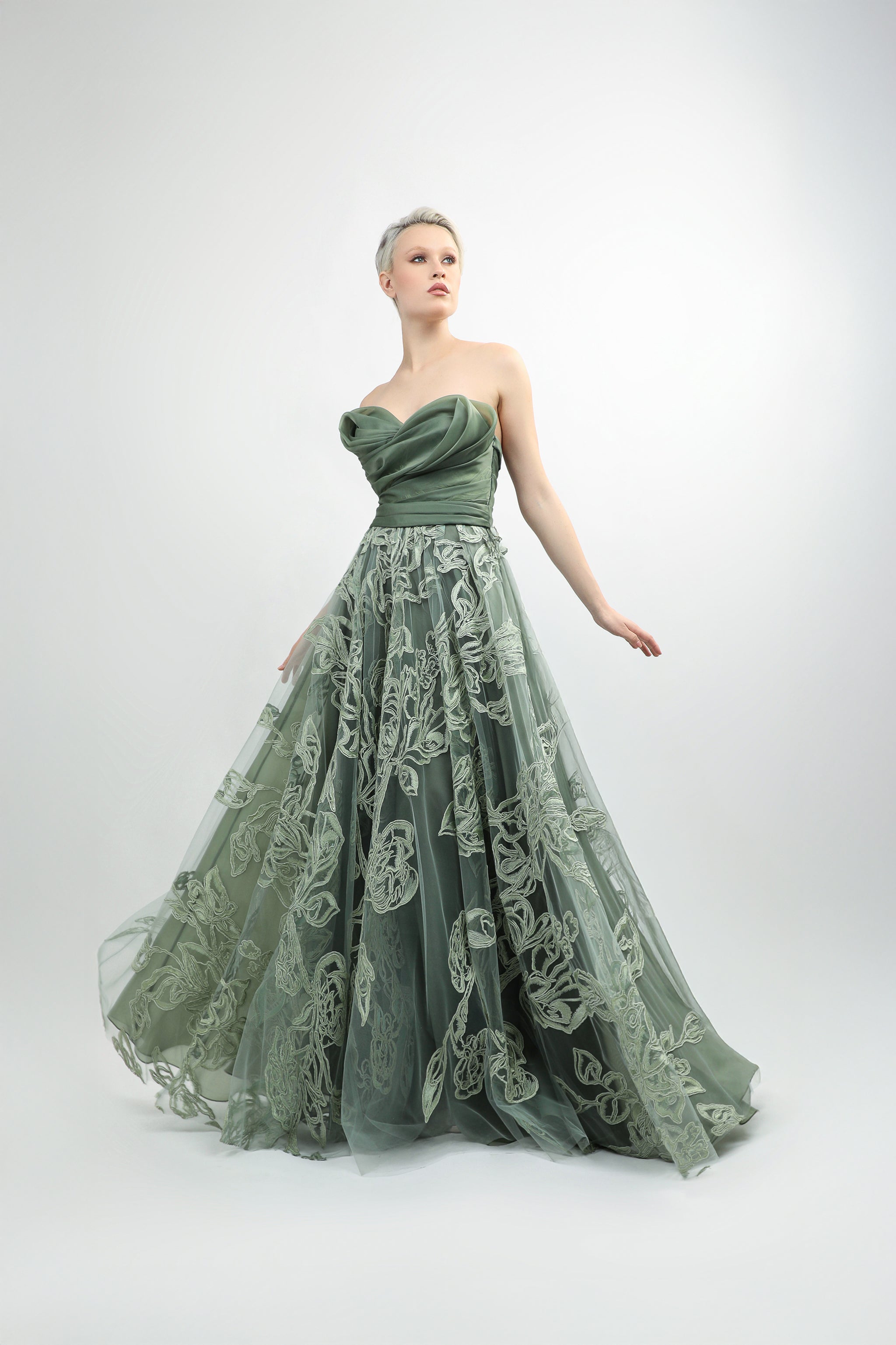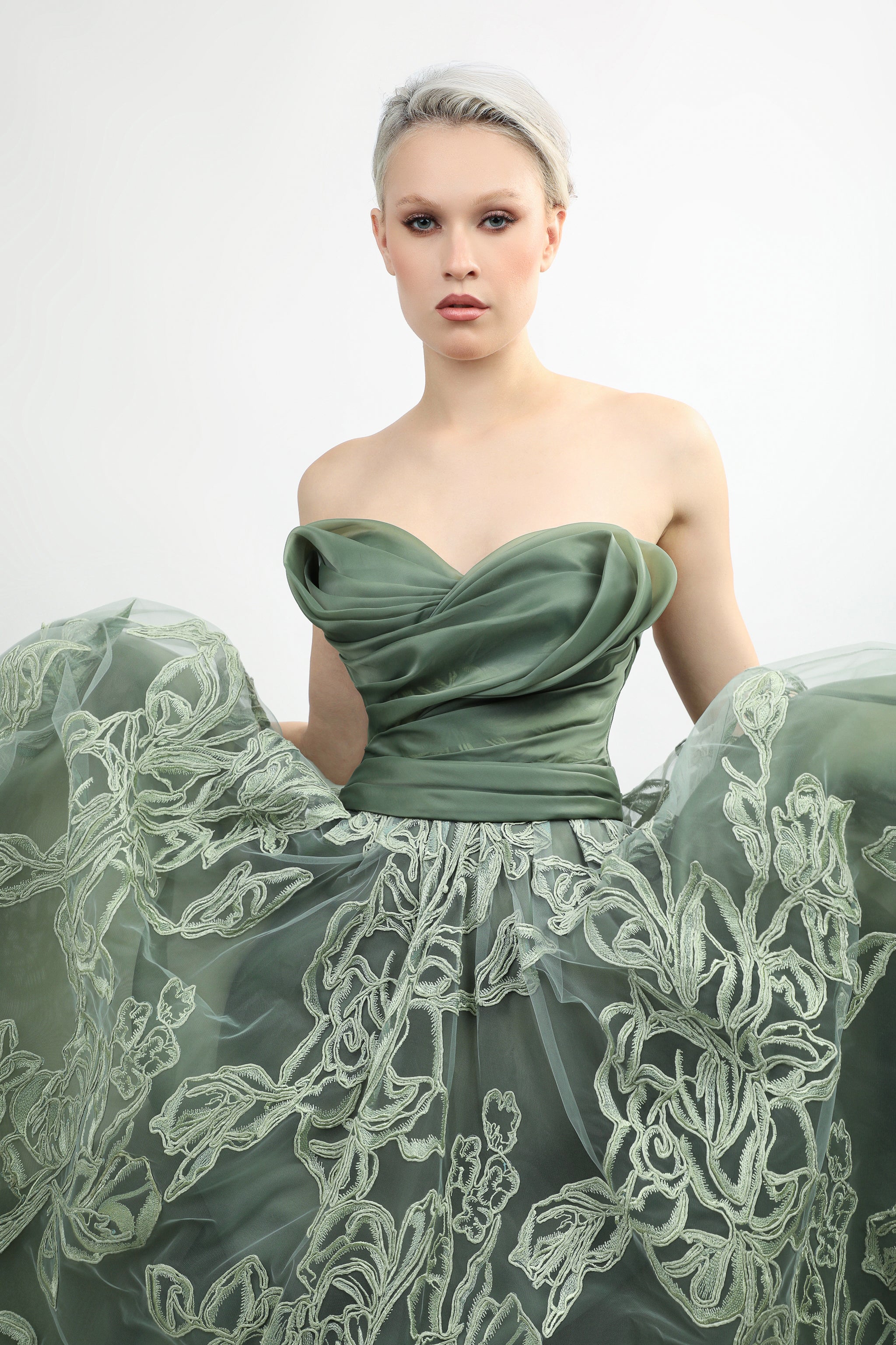 Strapless Tulle Princess cut Bridal Gown with Fading Embroidery