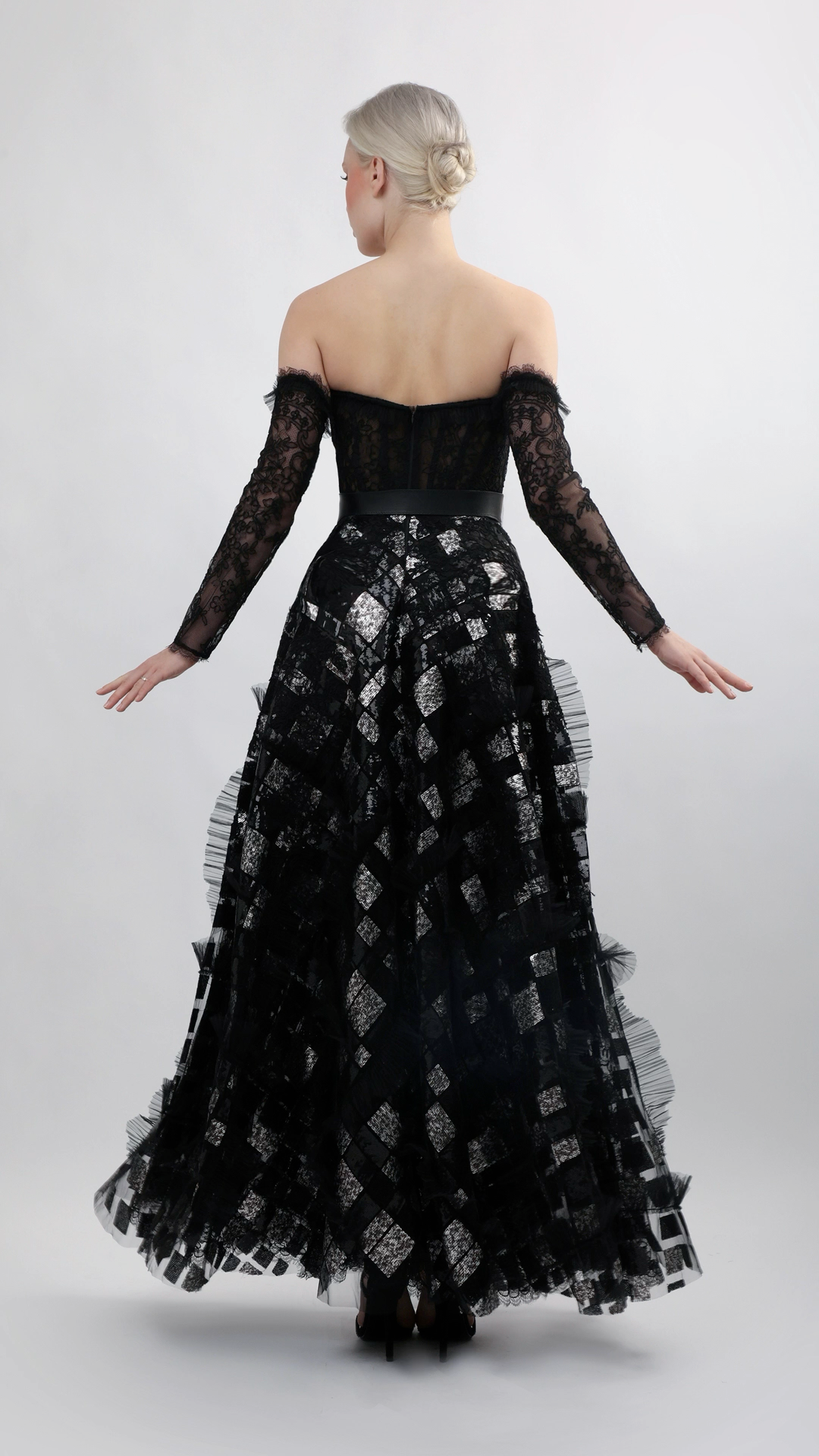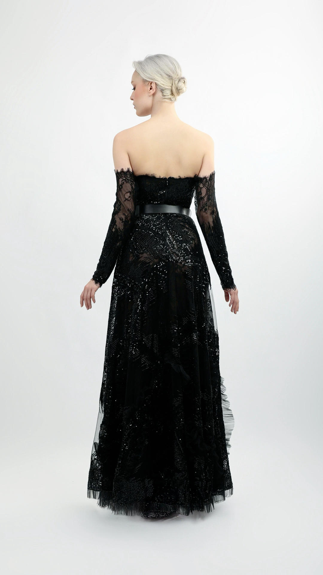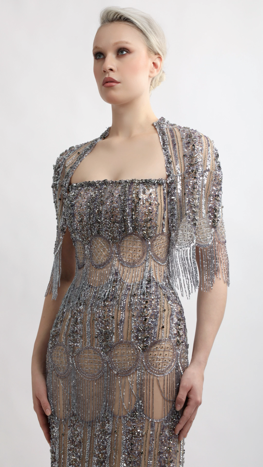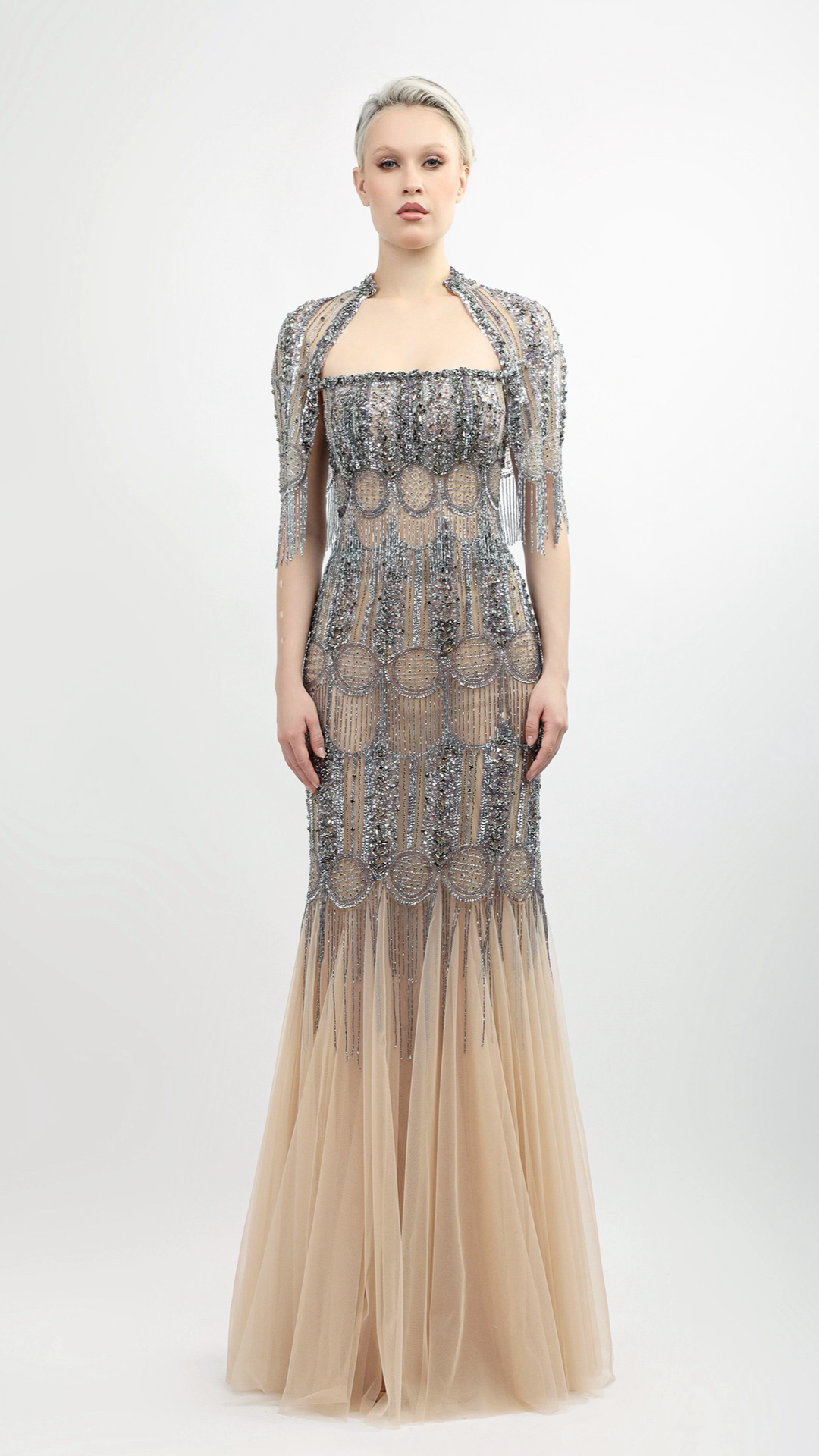 Tulle Sleeveless Gown with Flowing Shoulder Trail