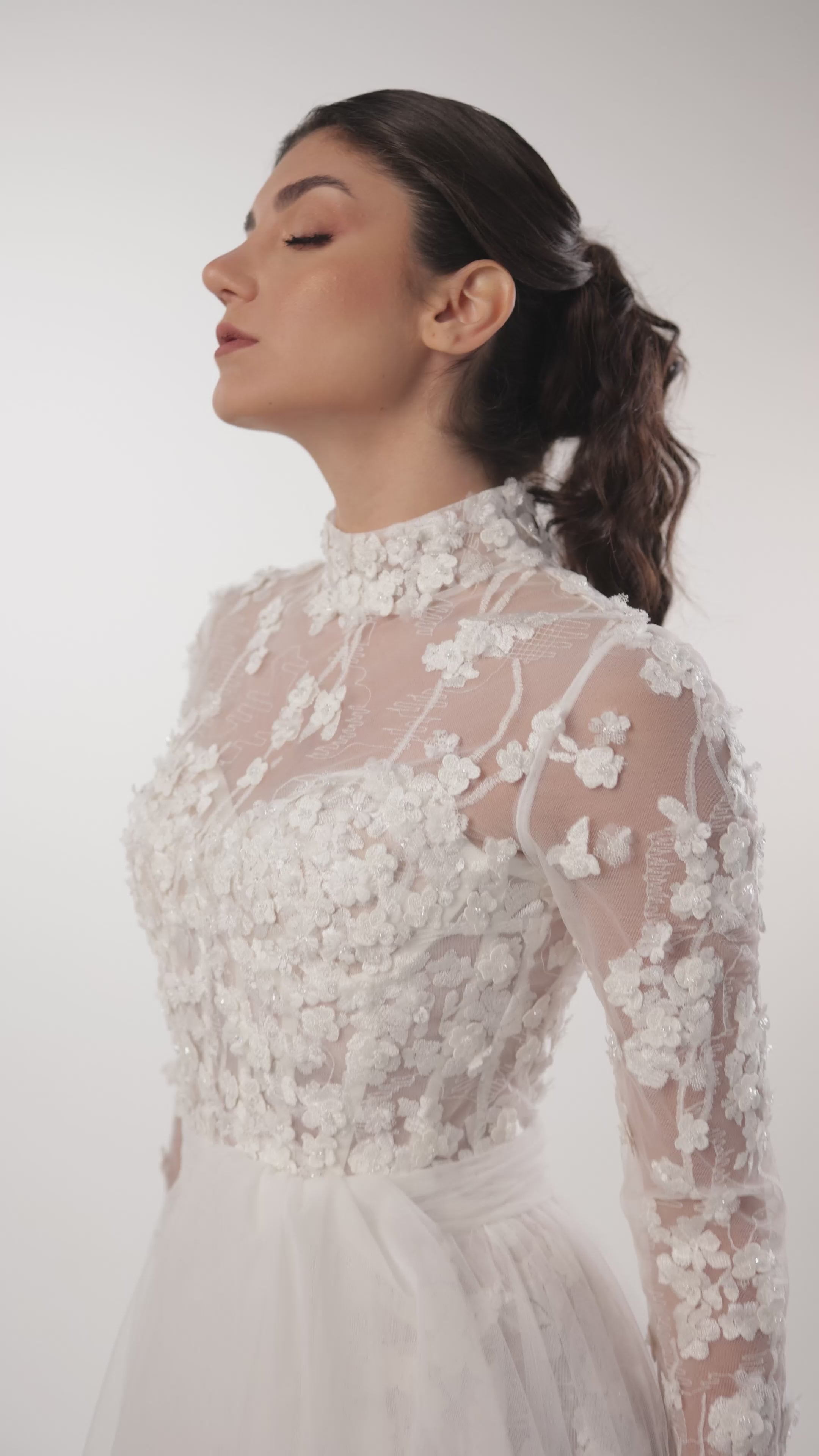 A-line long-sleeve bridal gown featuring 3D floral lace embroidery and a soft tulle ribbon belt defining the waist.