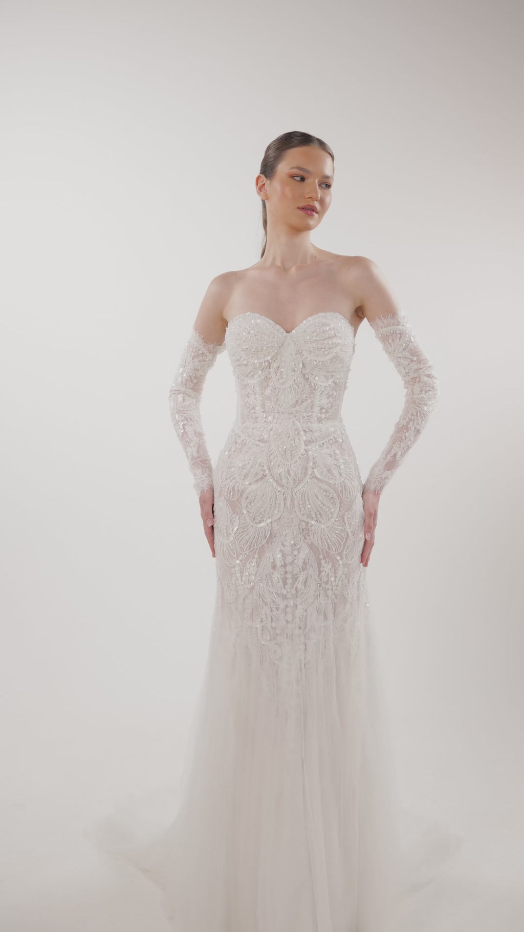 Sweetheart mermaid gown with lace appliqué and Swarovski crystal embellishments, completed with matching embellished sleeves.