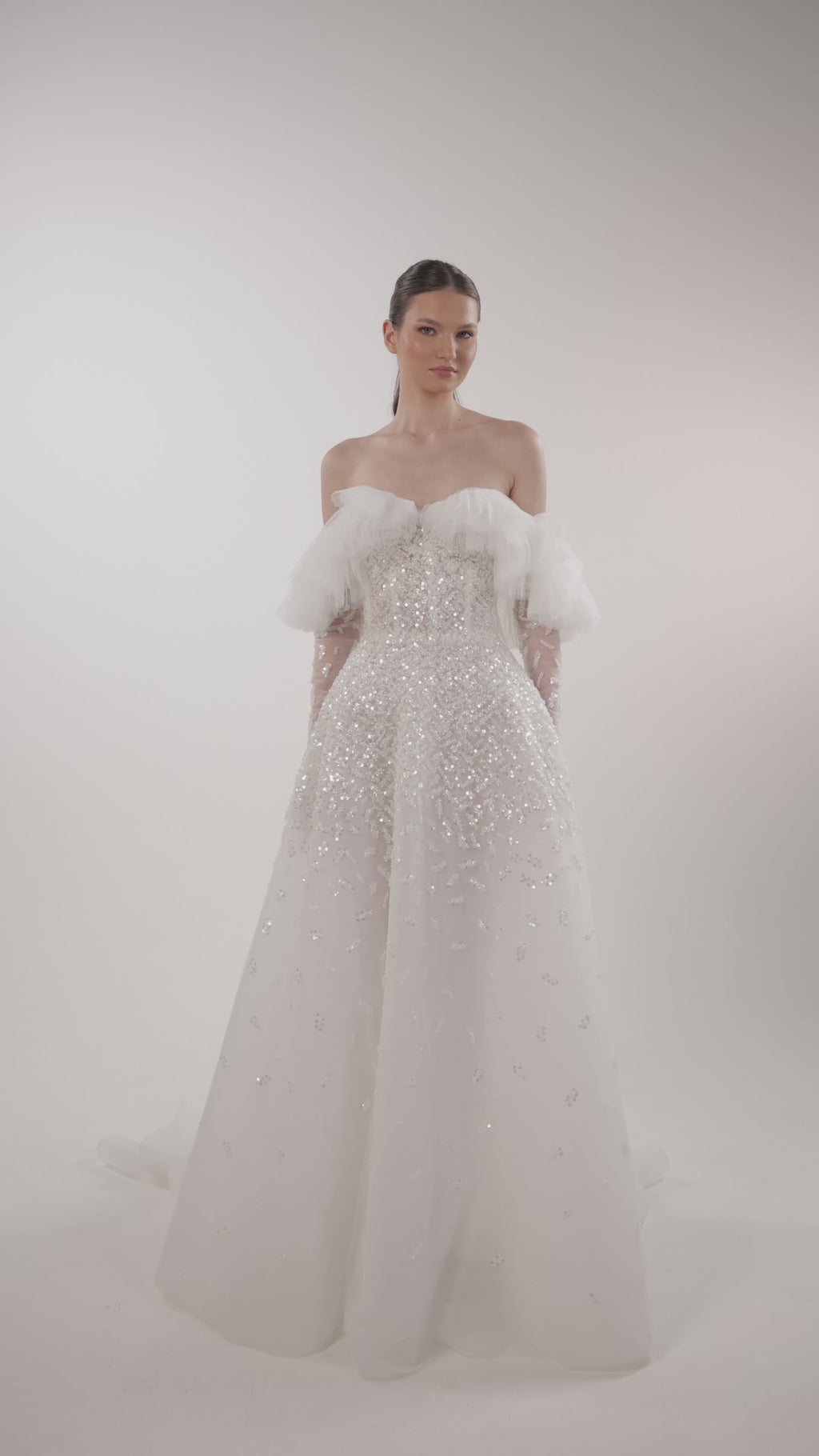 Ruffled off-shoulder mini princess gown with long gloves and geometric embroidery for an elegant feminine statement.