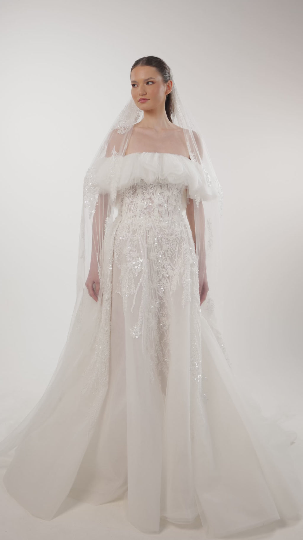 Off-shoulder princess gown with sculpted ruffle layers and embroidery that softens toward a flowing wave-like skirt.