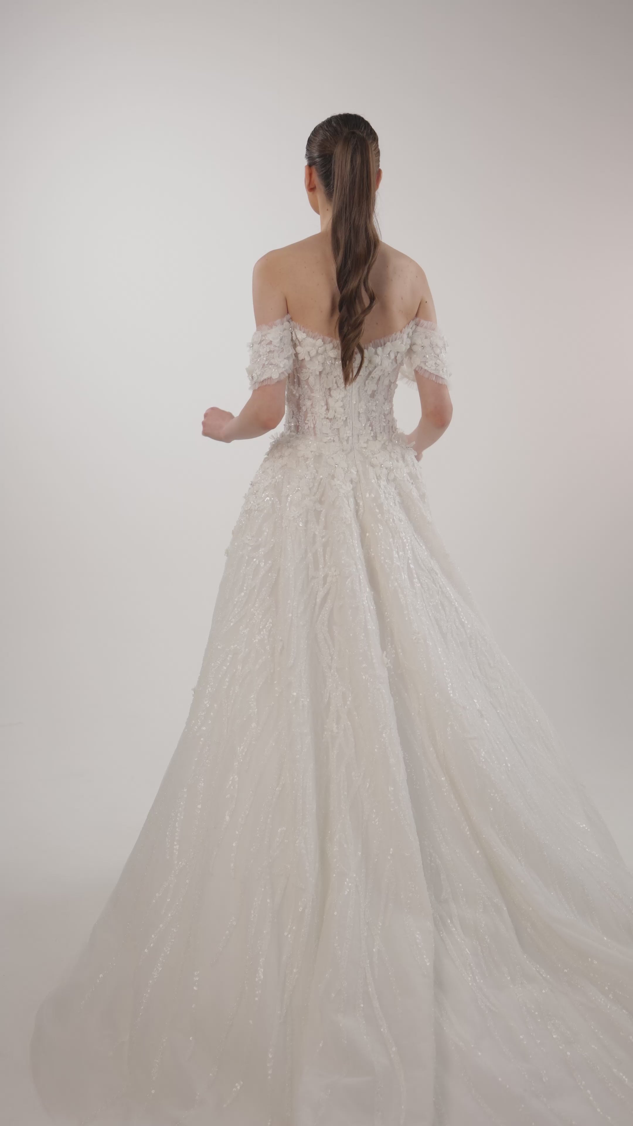 Off-shoulder sweetheart princess gown with 3D floral embroidery and stem-like details across the skirt.