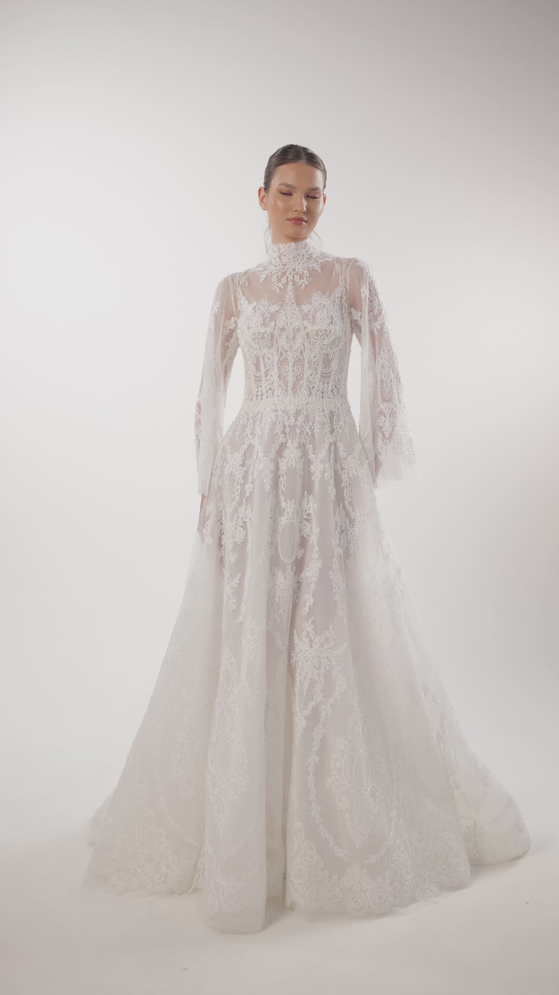 A-line vintage-inspired gown in embroidered tulle with loose sleeves, a high neck, and a corset-style bodice.