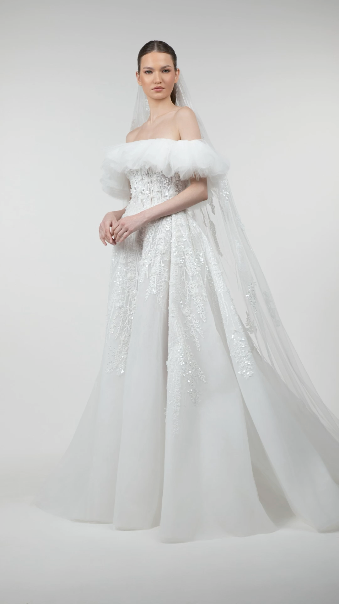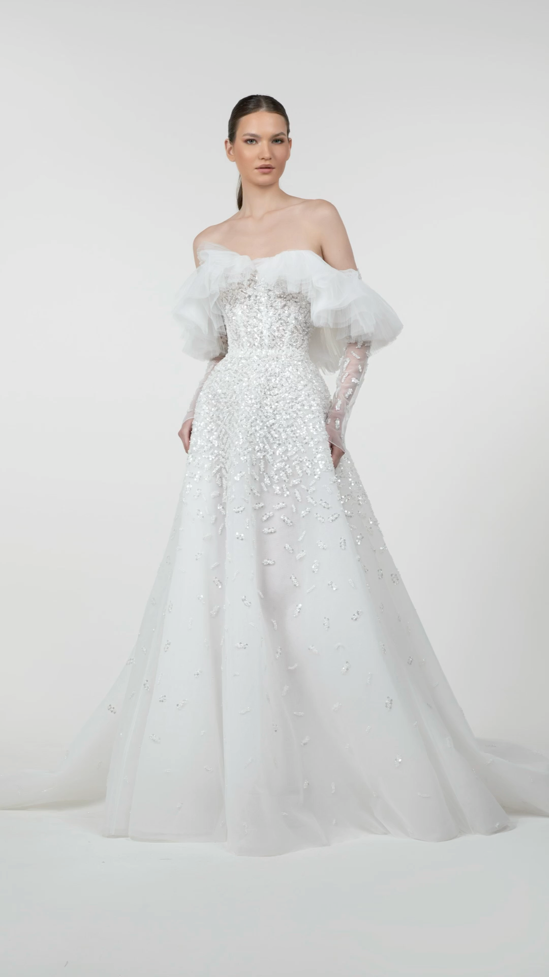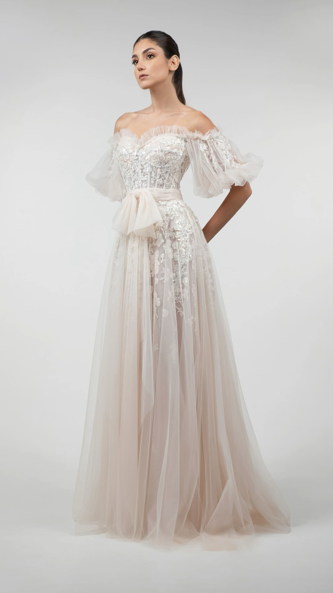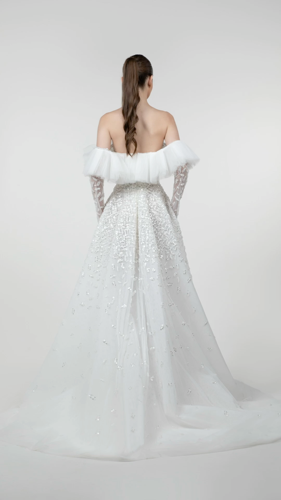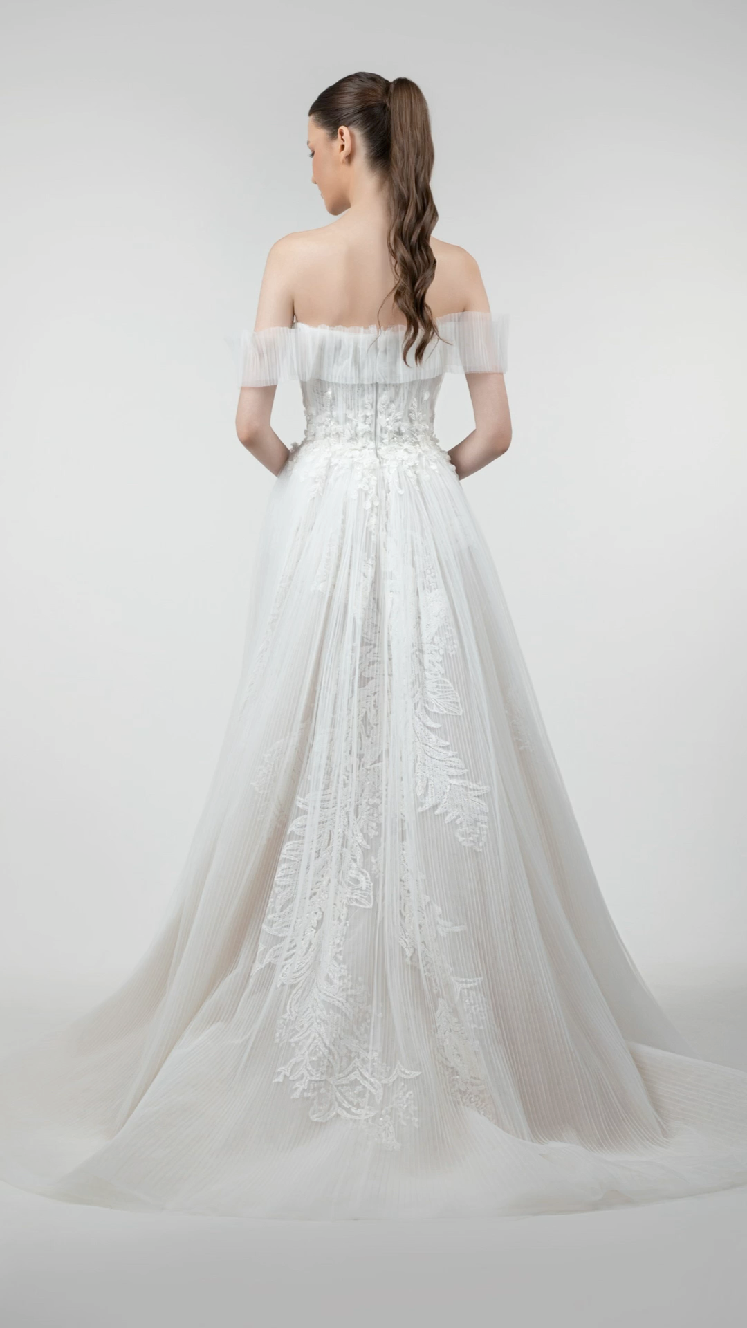 Off-Shoulder A-Line Gown with Pleated Tulle