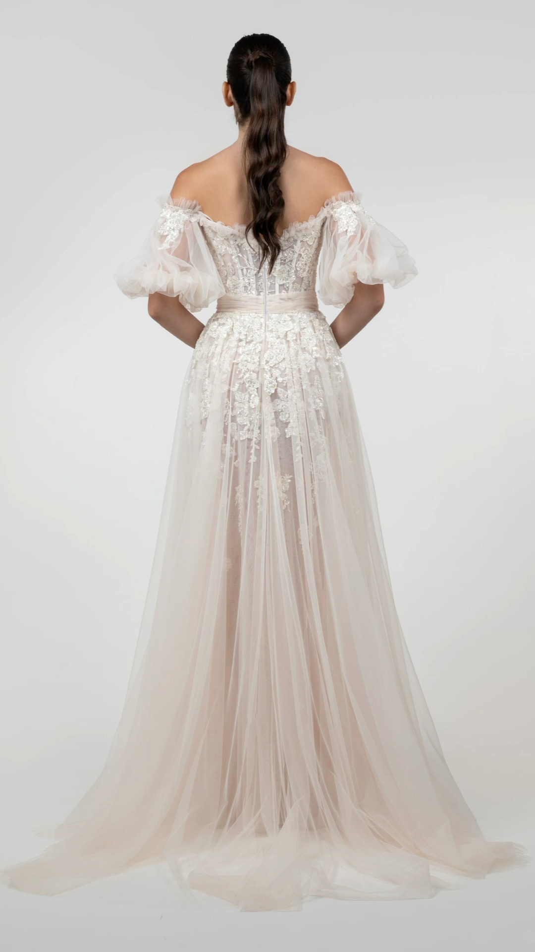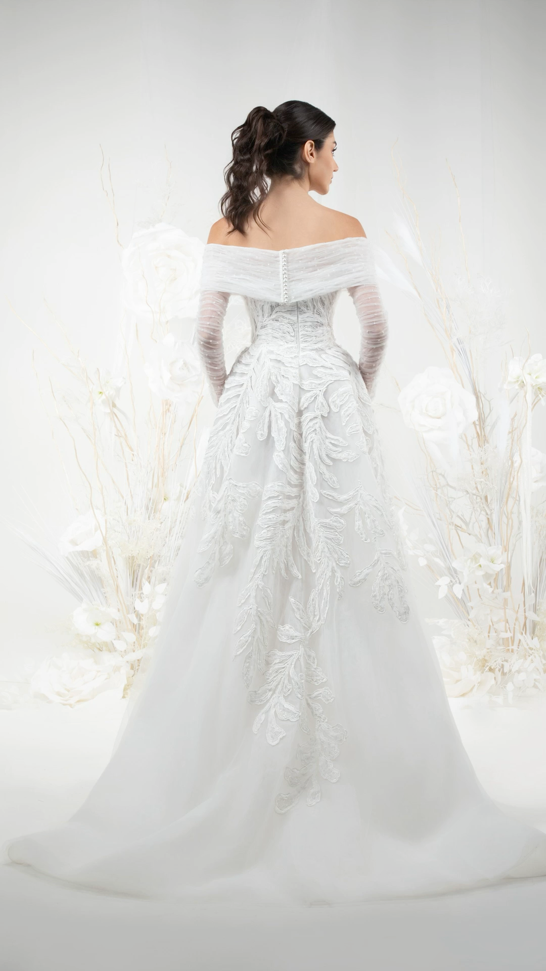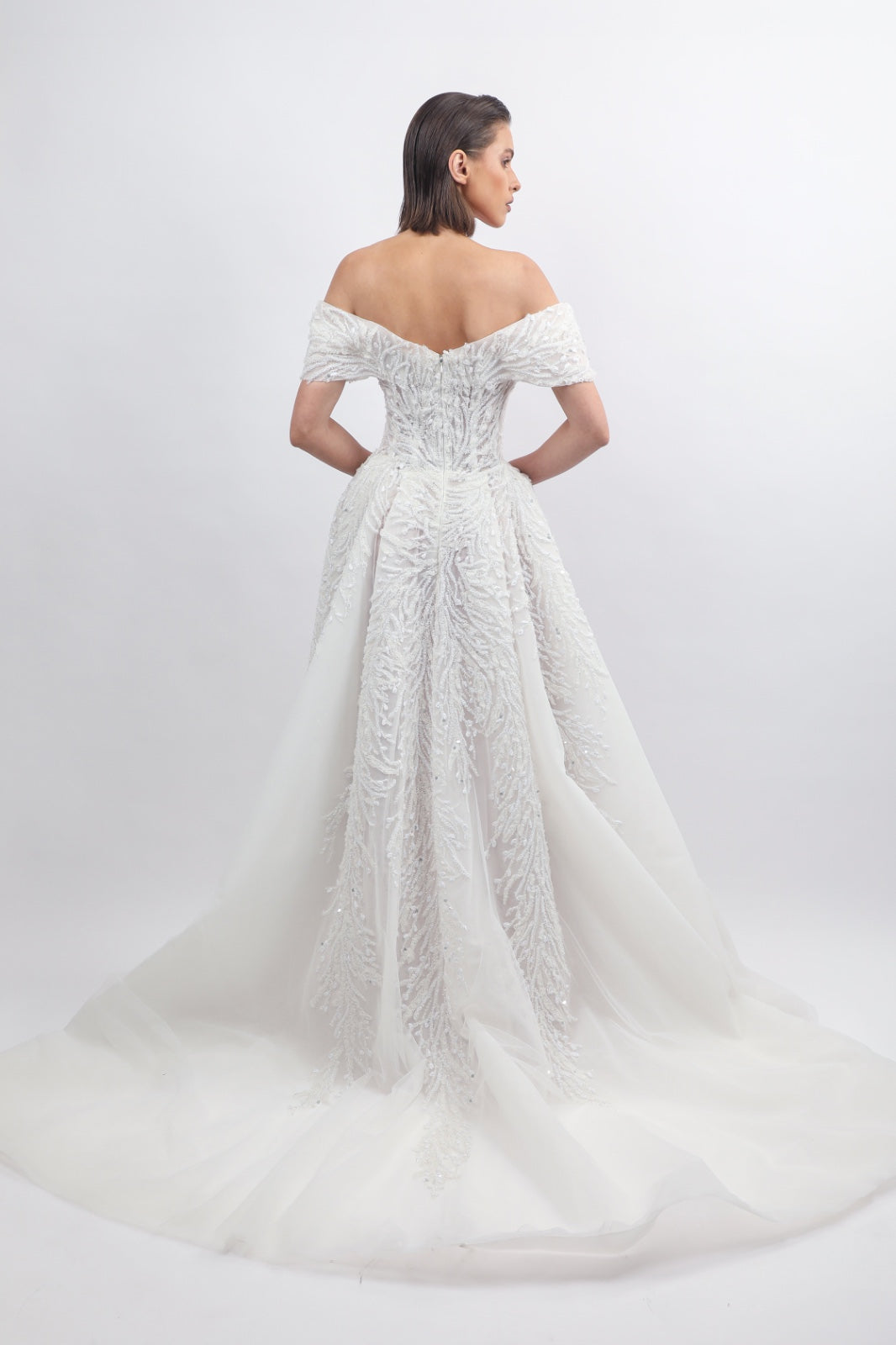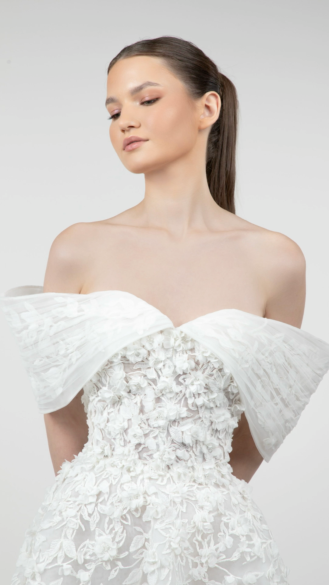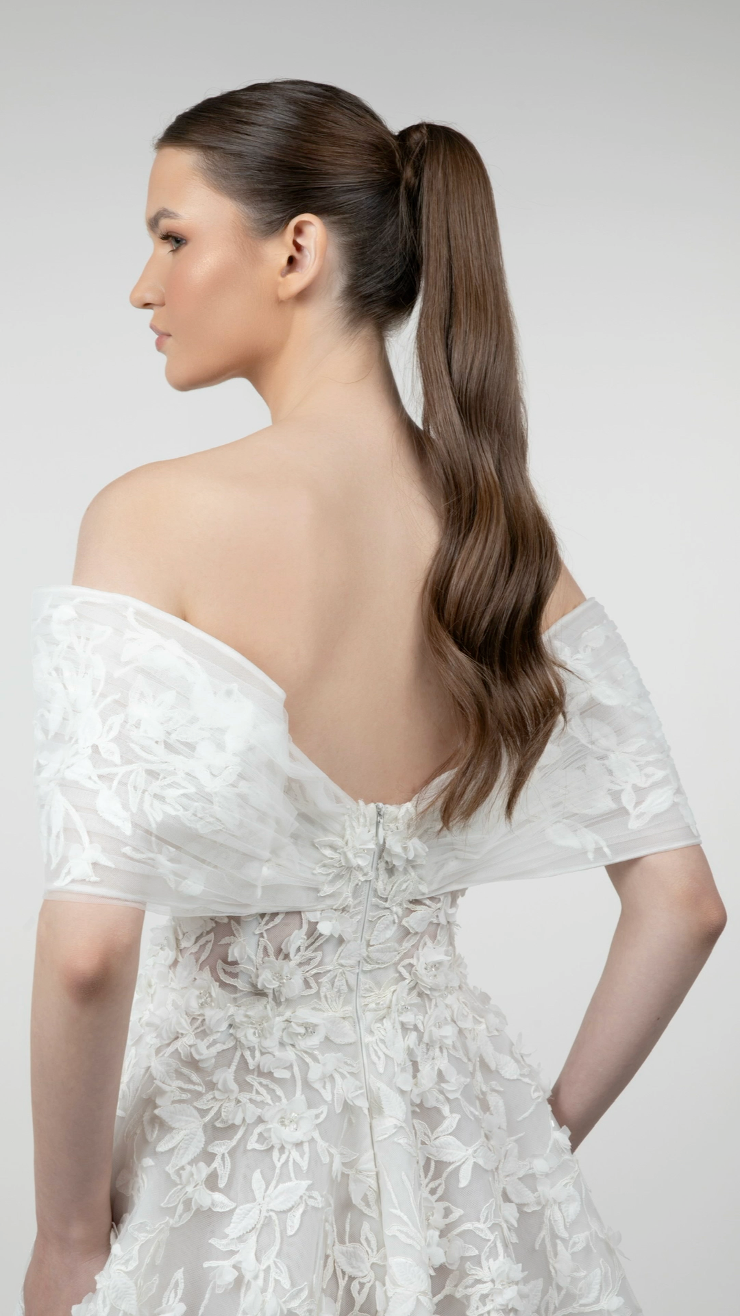 Off-Shoulder A-Line Gown with Pleated Tulle