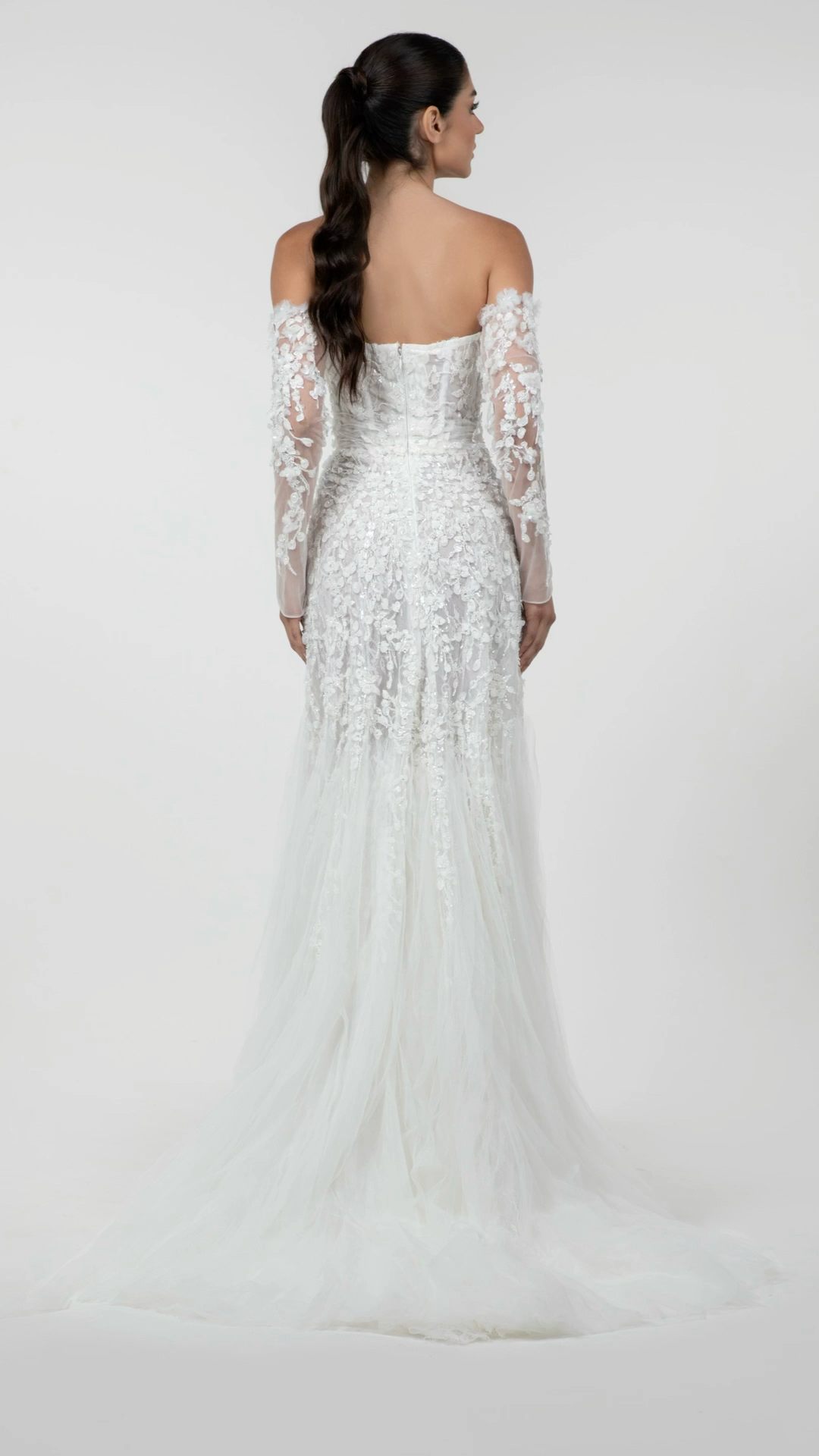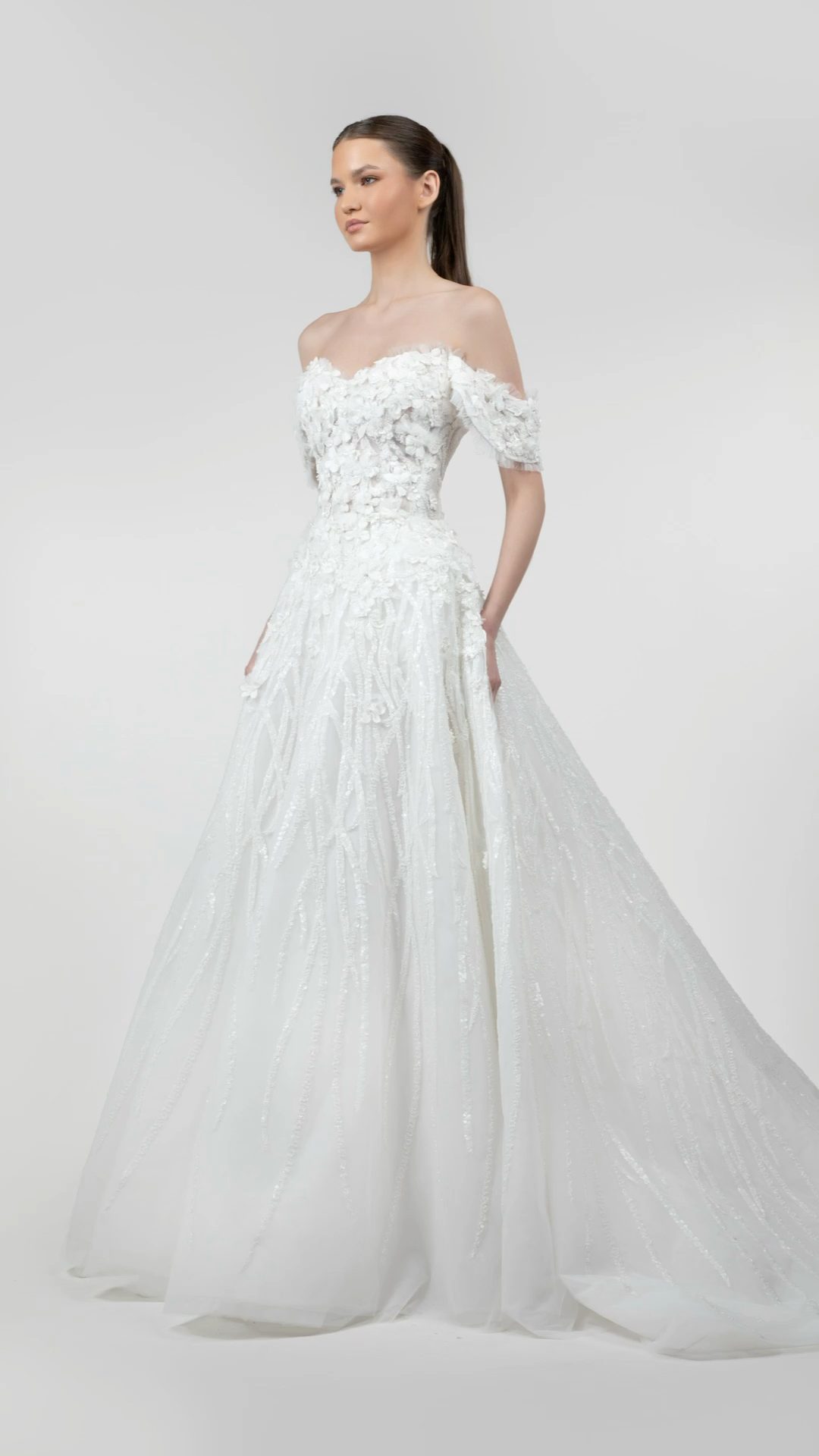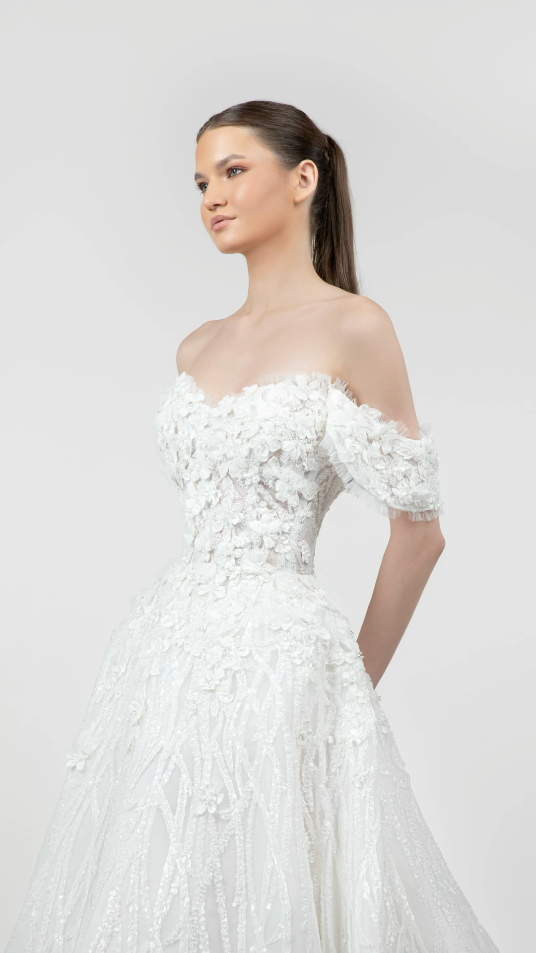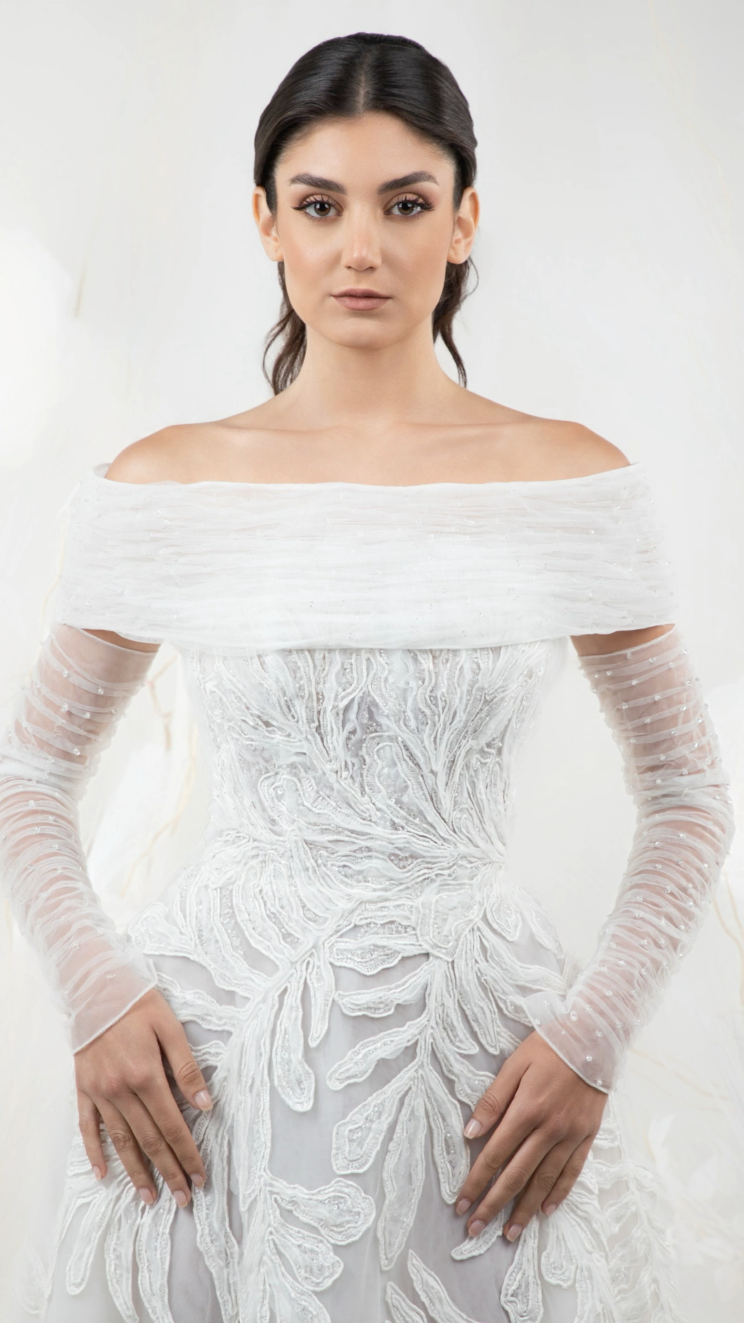 Off-Shoulder A-Line Gown with Pleated Tulle