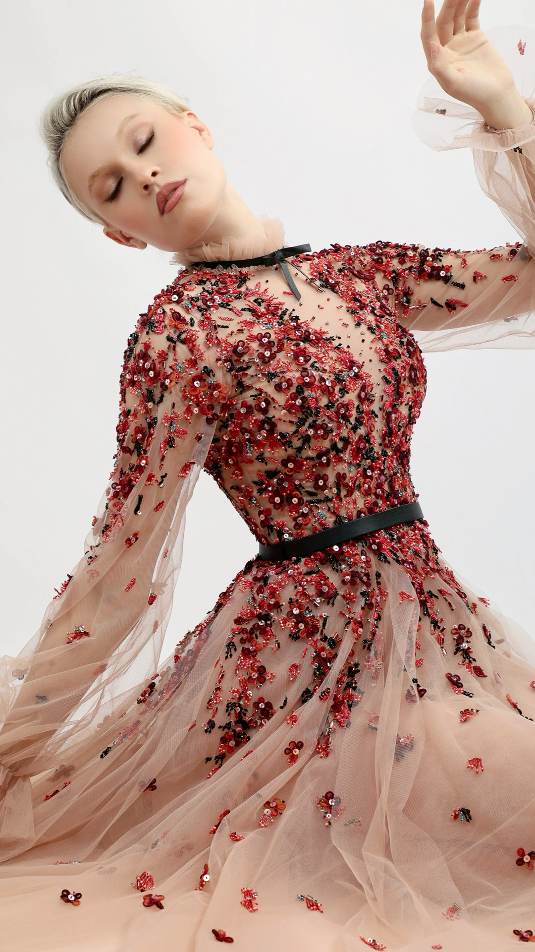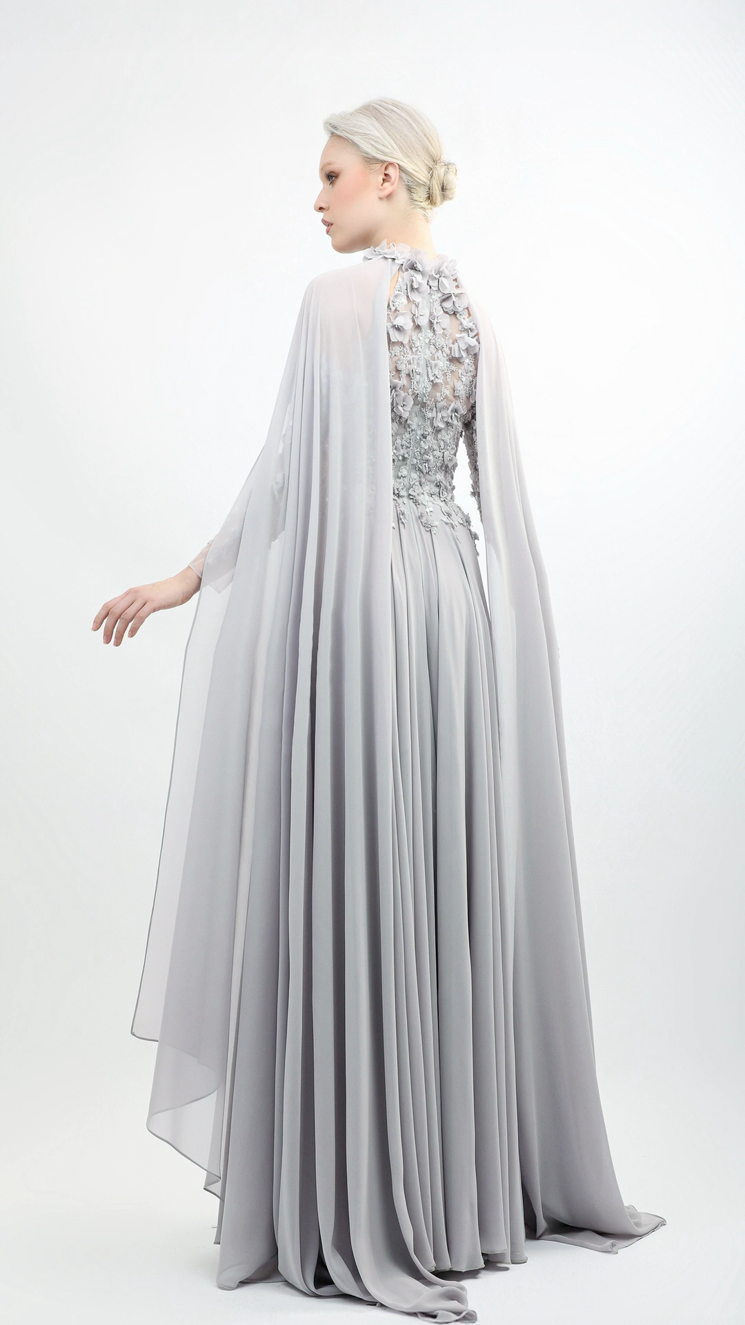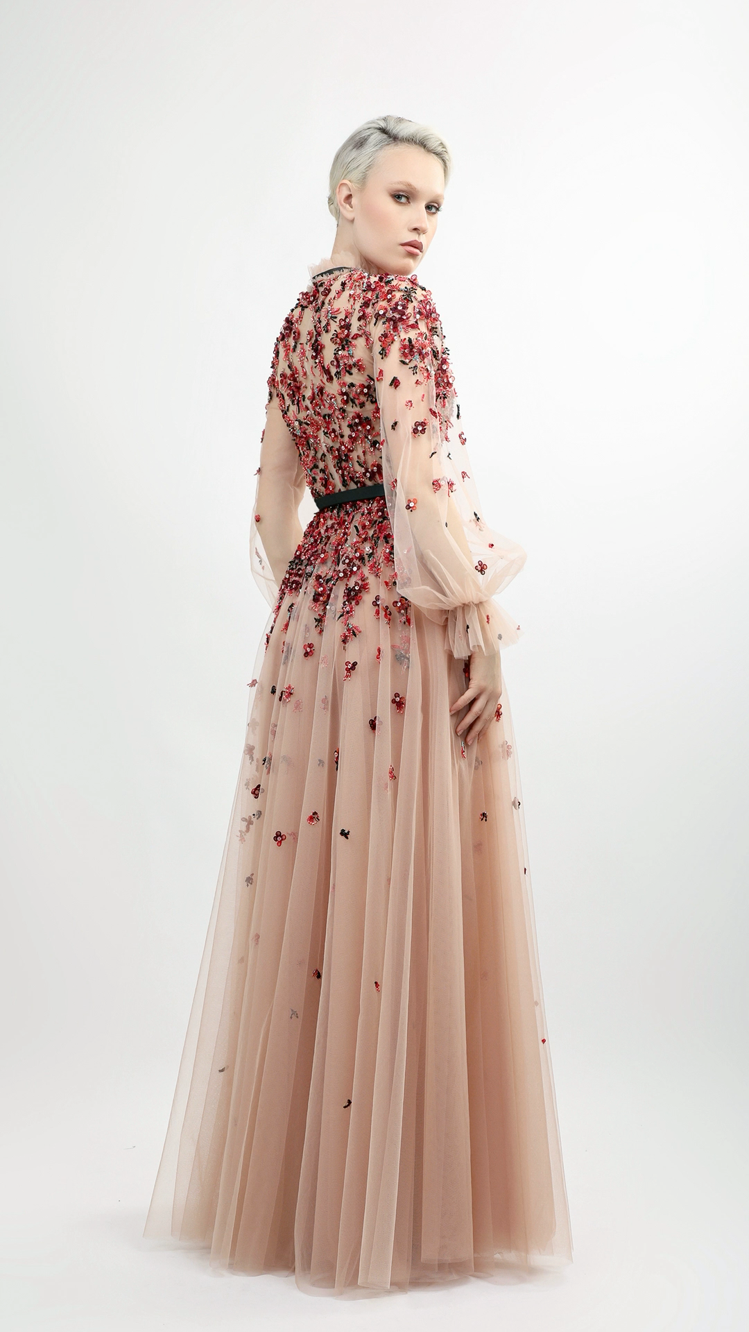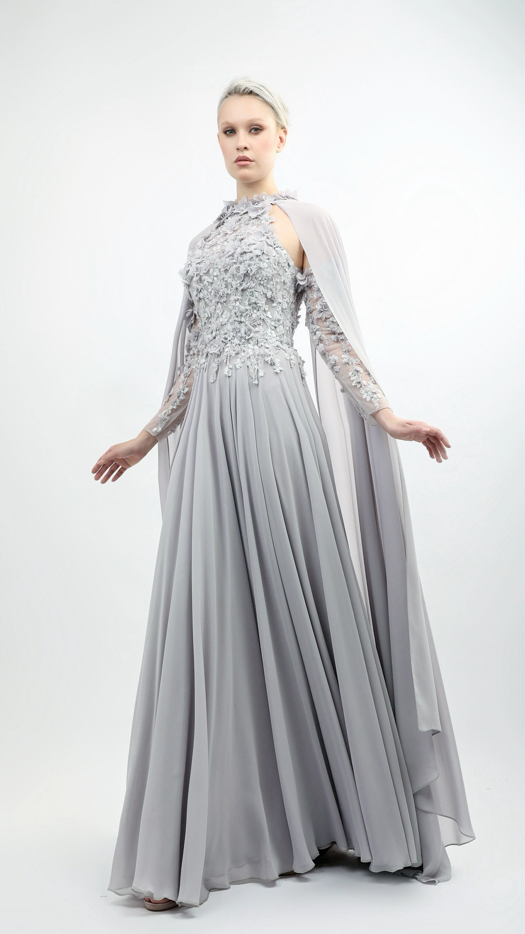 High-Neck Mousseline Gown with Handmade Flowers and Embroidery