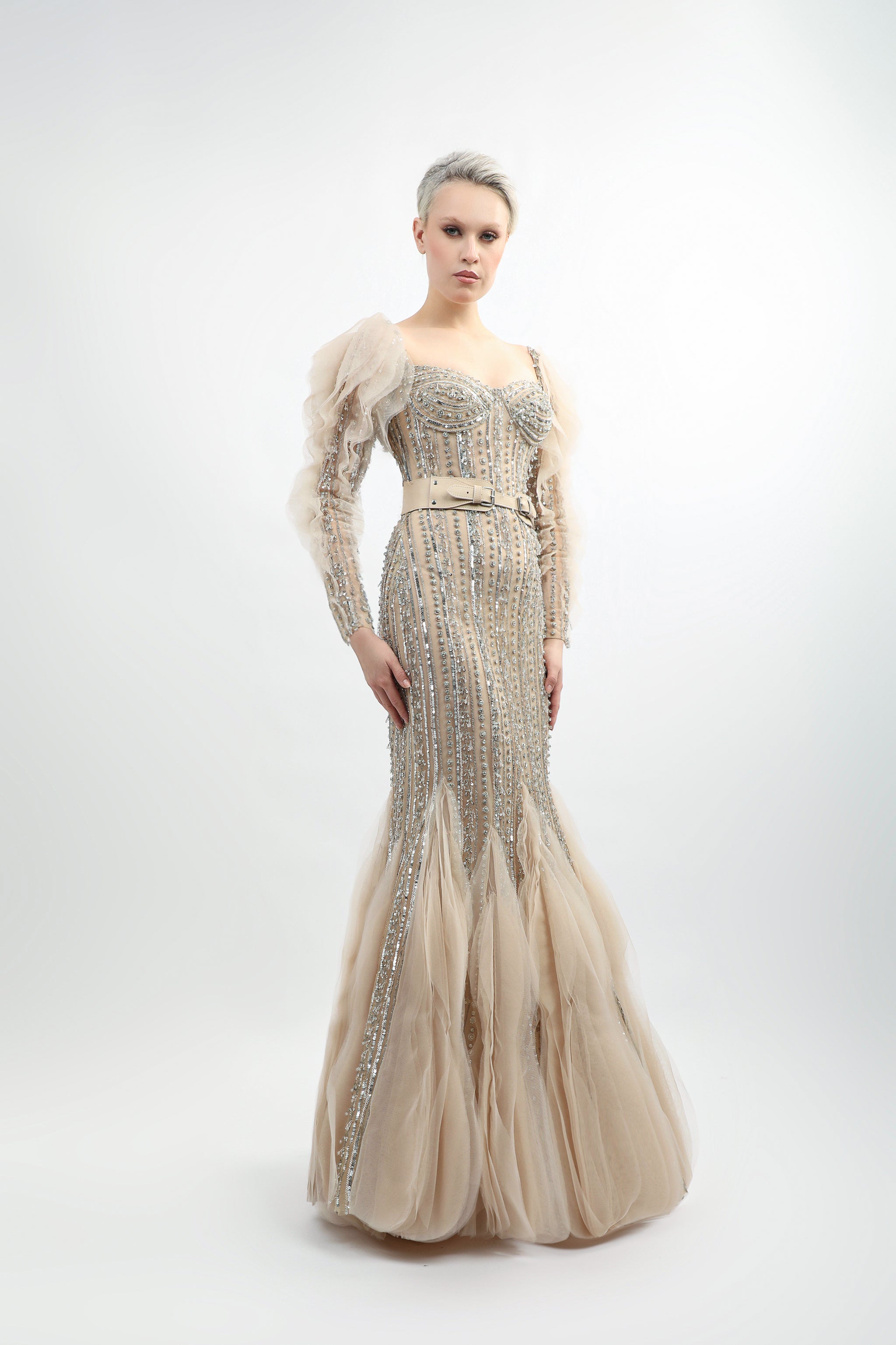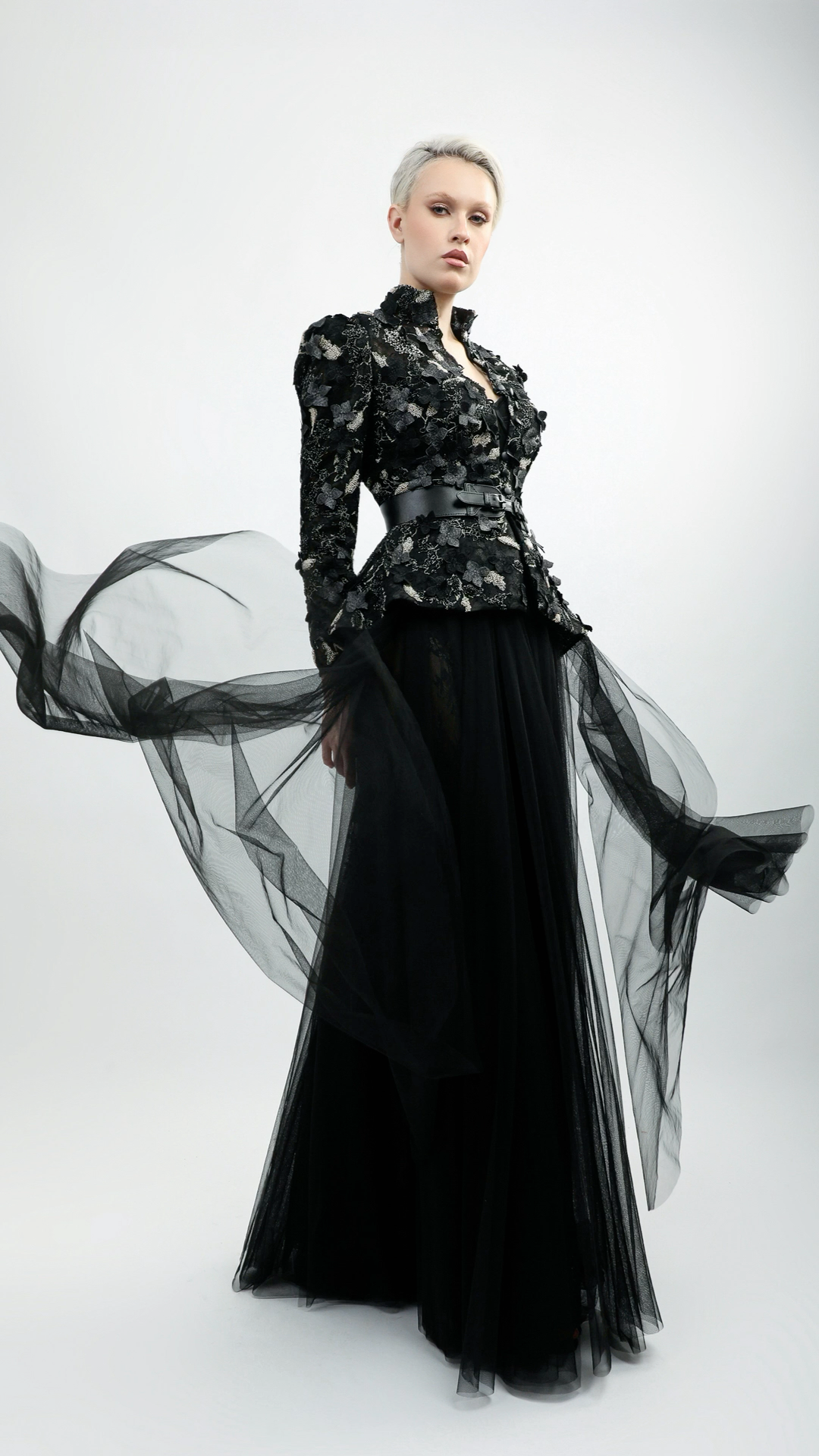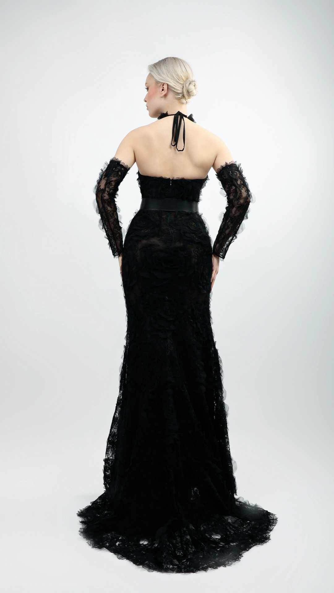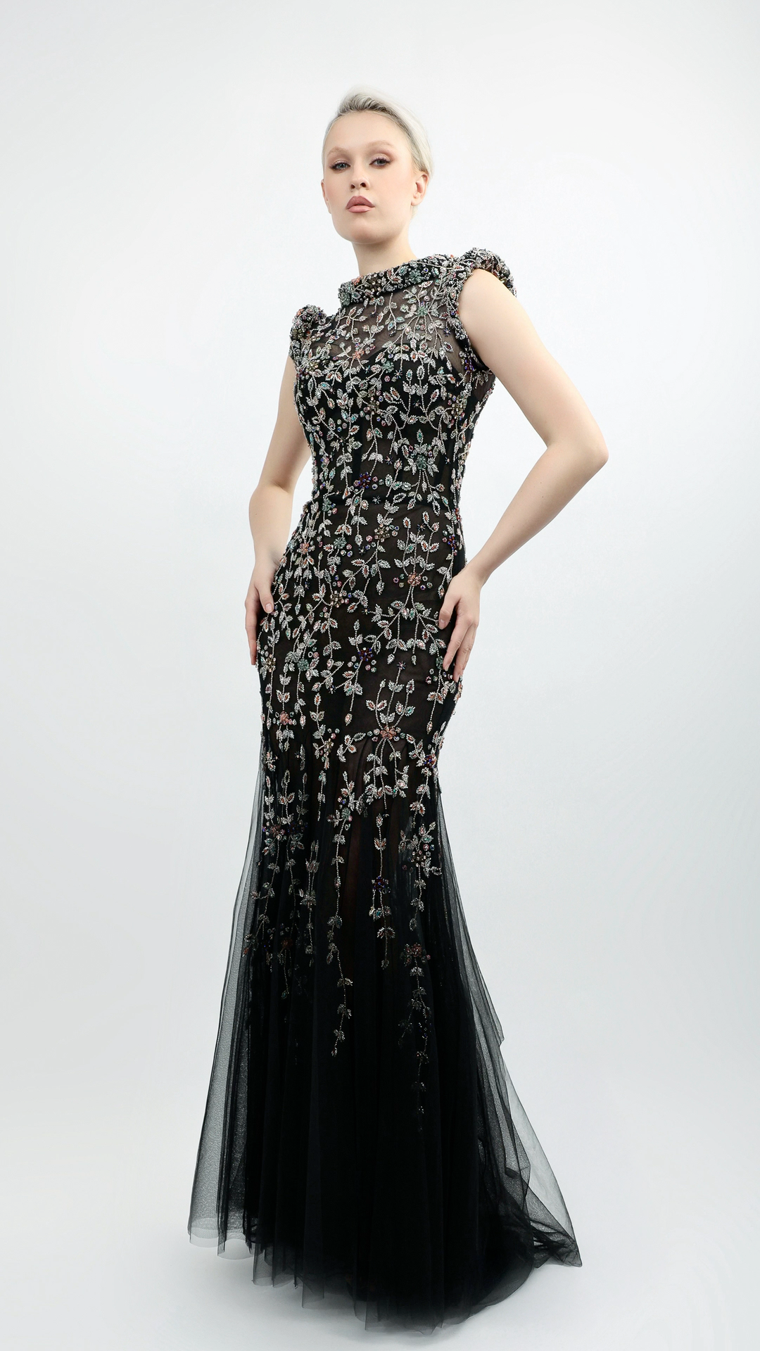 High-Neck Mousseline Gown with Handmade Flowers and Embroidery