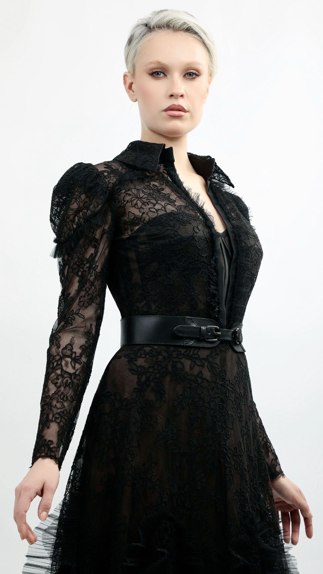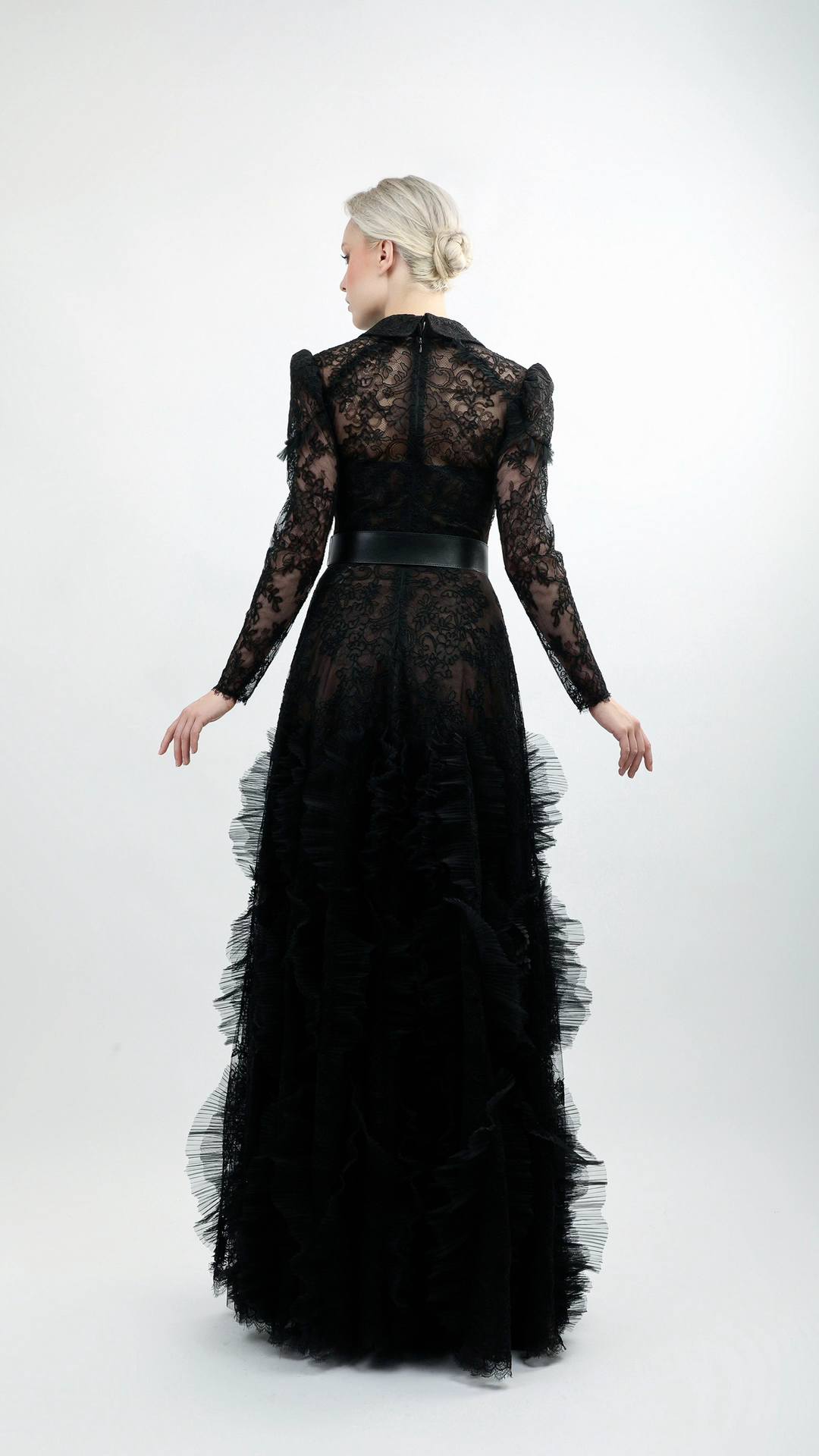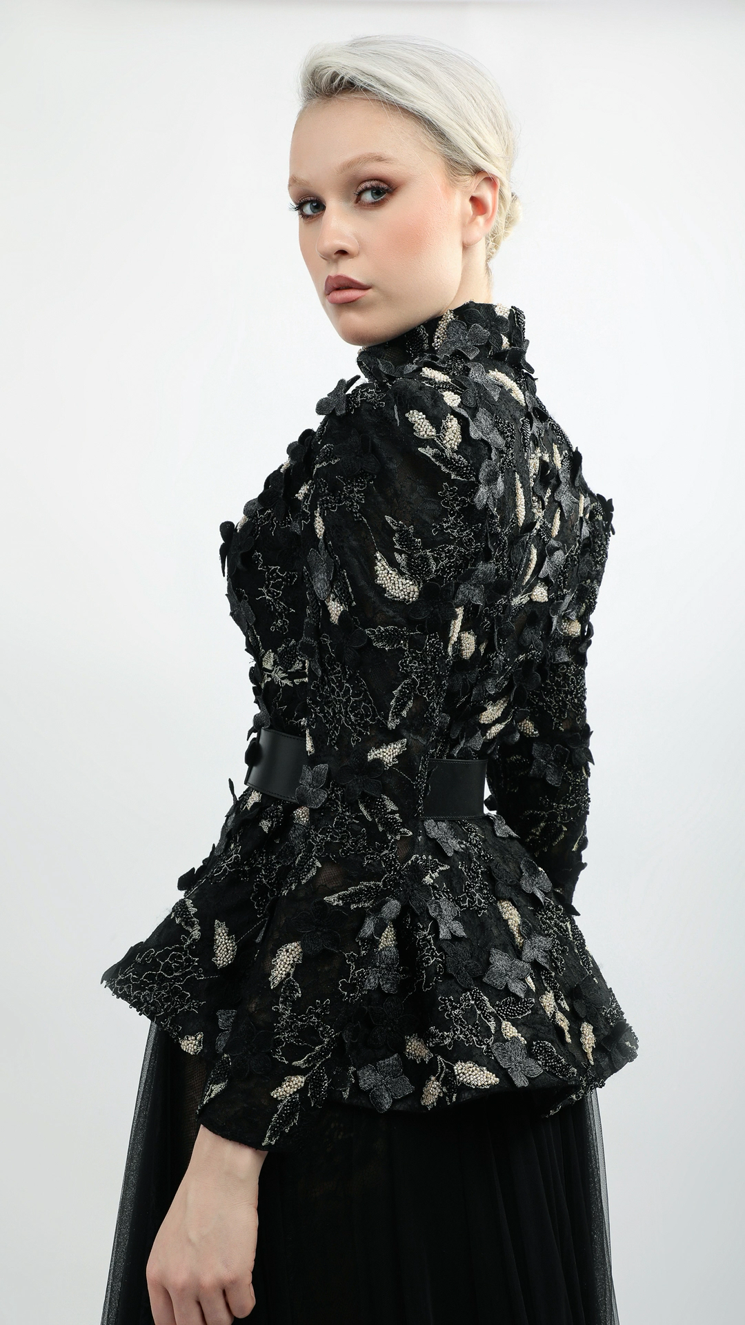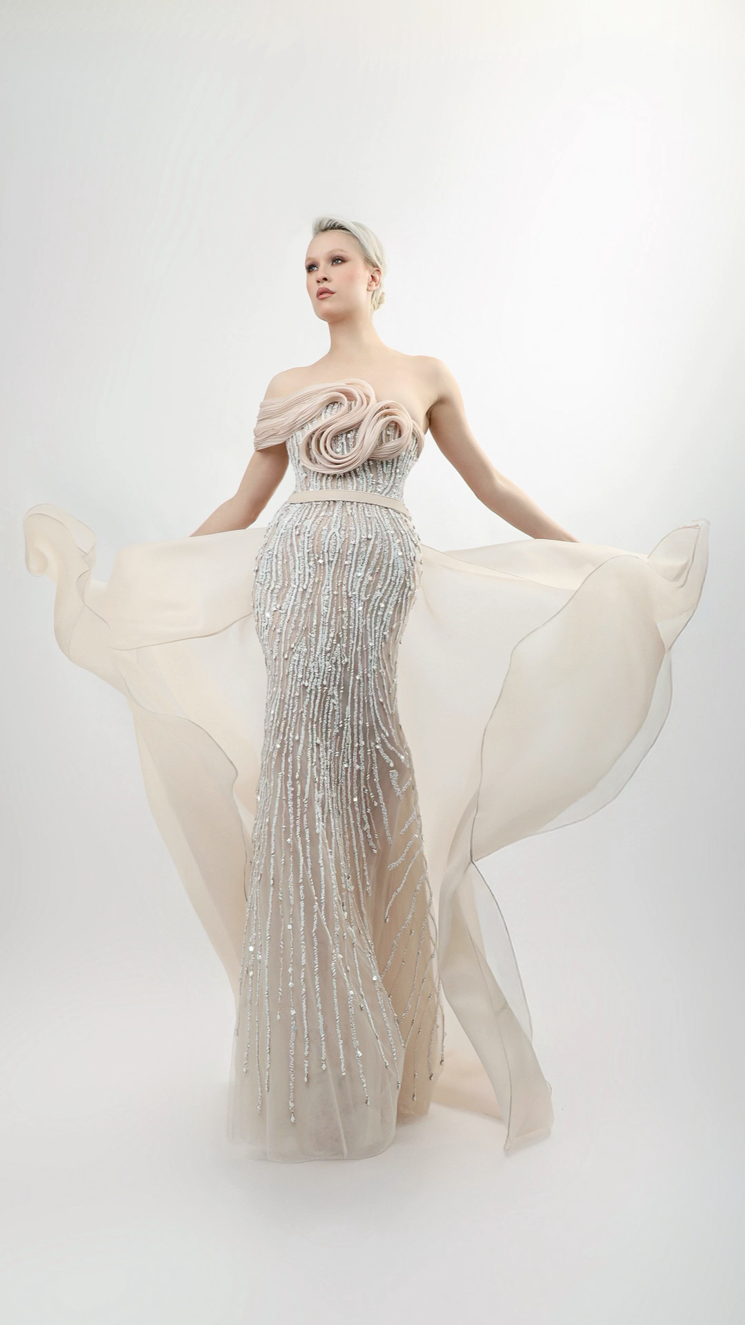 High-Neck Mousseline Gown with Handmade Flowers and Embroidery