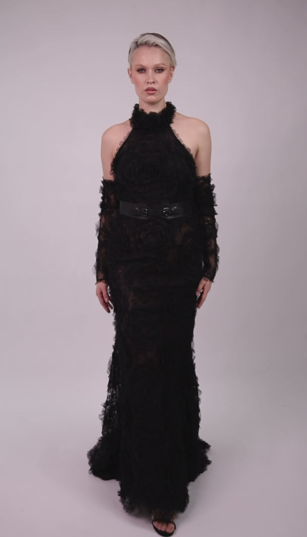 A high-neck mermaid lace gown featuring exquisite floral-inspired ruffles, paired with dramatic glove sleeves and a statement leather belt.