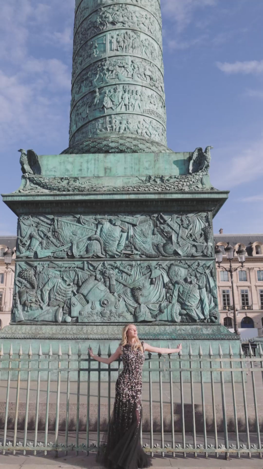 A striking mermaid-cut tulle gown fully embroidered and styled with a sculpted neckline and elegant cut-off sleeves.