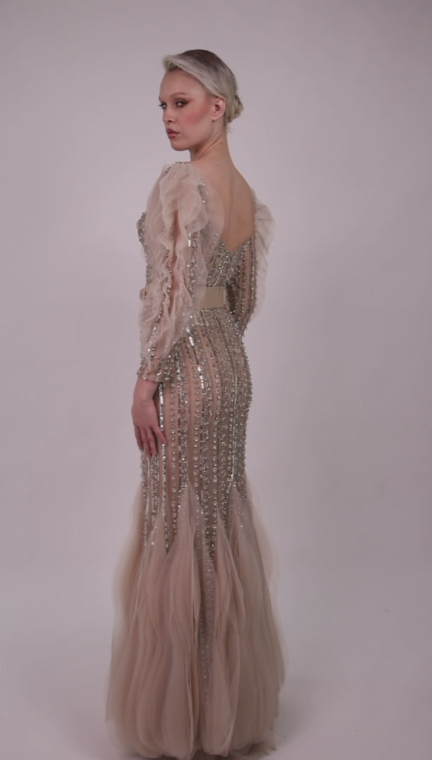 Embroidered Tulle Gown with Long Sleeves and Belt | 1016