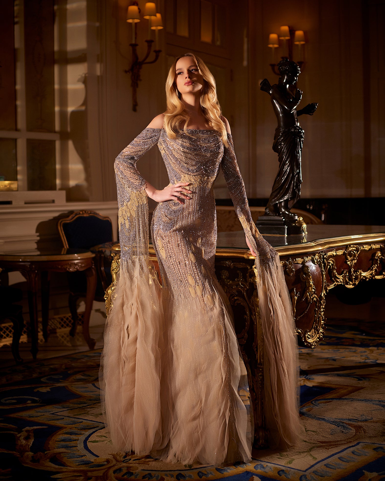 Flowy Embroidered Tulle Gown with Wide Sleeves