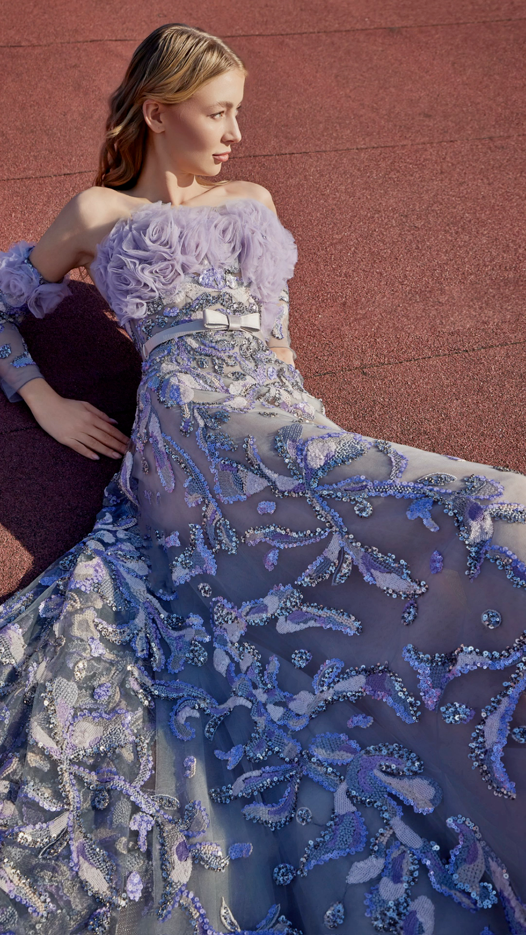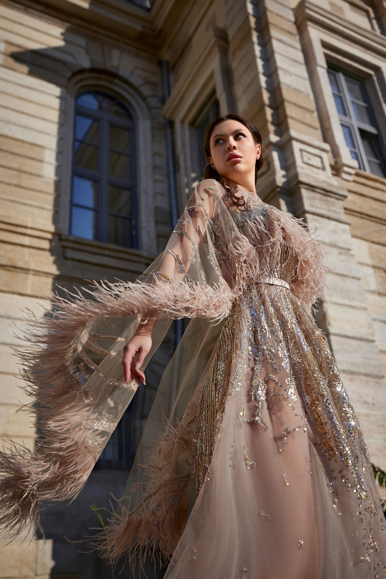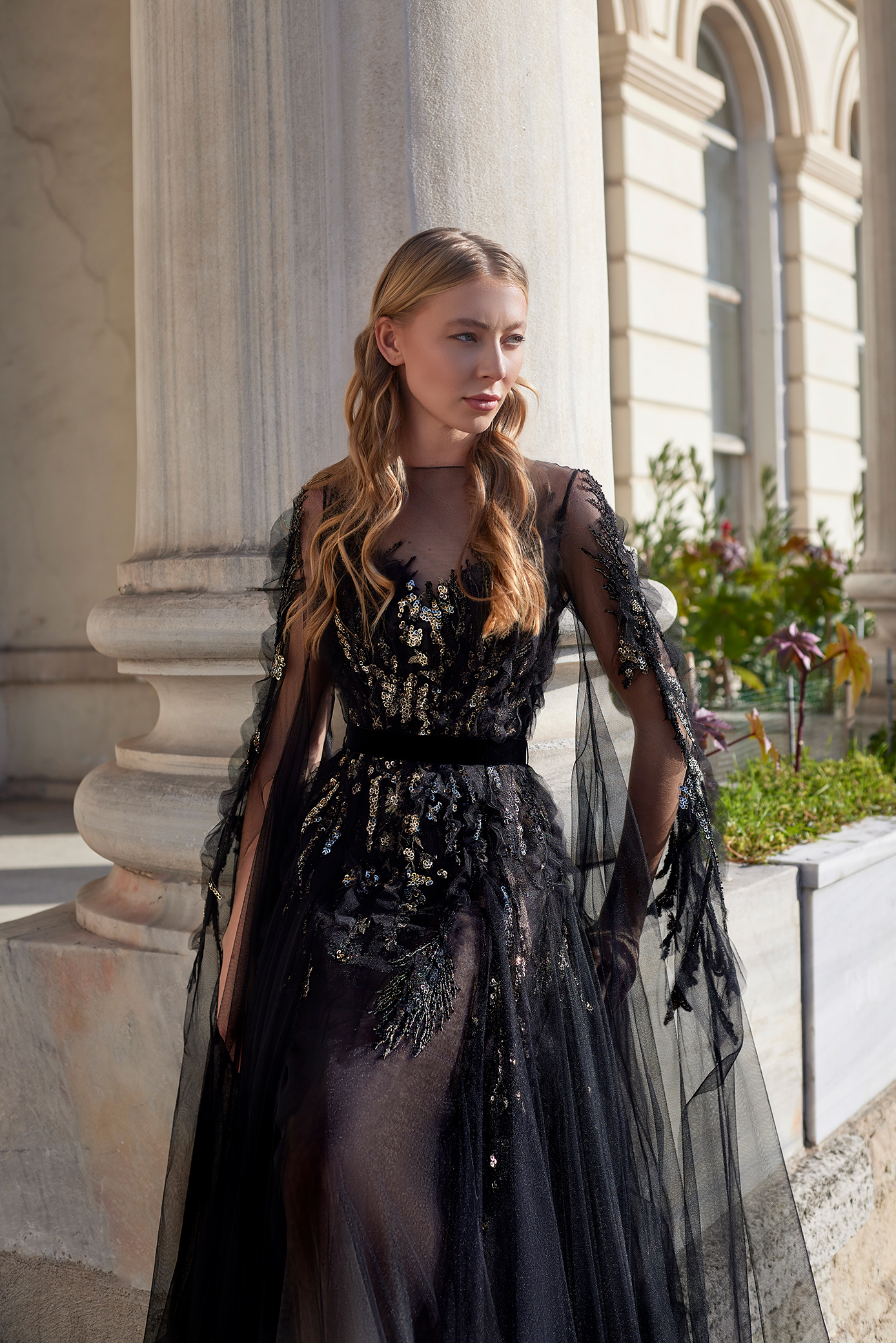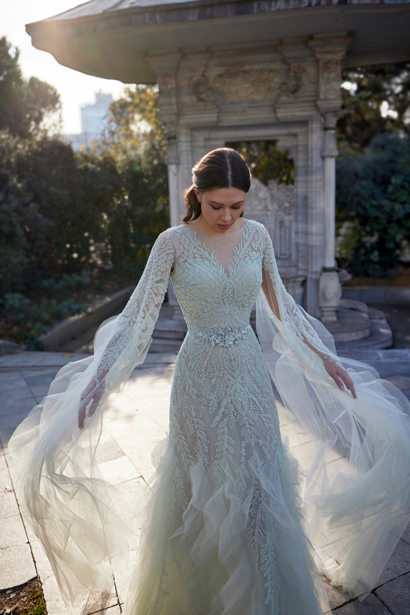 Flowy Embroidered Tulle Gown with Wide Sleeves