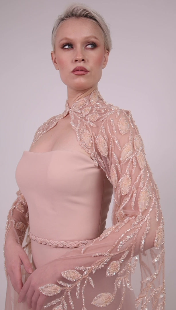 Strapless Crepe Gown with Embroidered Cape | 1024Strapless Crepe Gown with Embroidered Cape | 1024