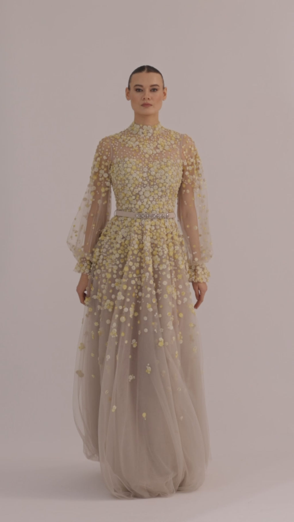 Long-Sleeve Tulle Gown with Floral Embroidery | 933