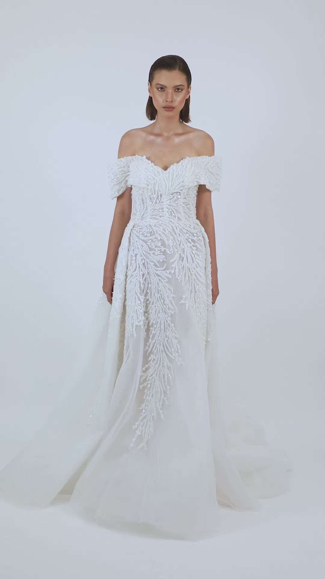Off-shoulder cache-cœur princess gown with hand-embroidered stem motifs and subtle crystal accents.