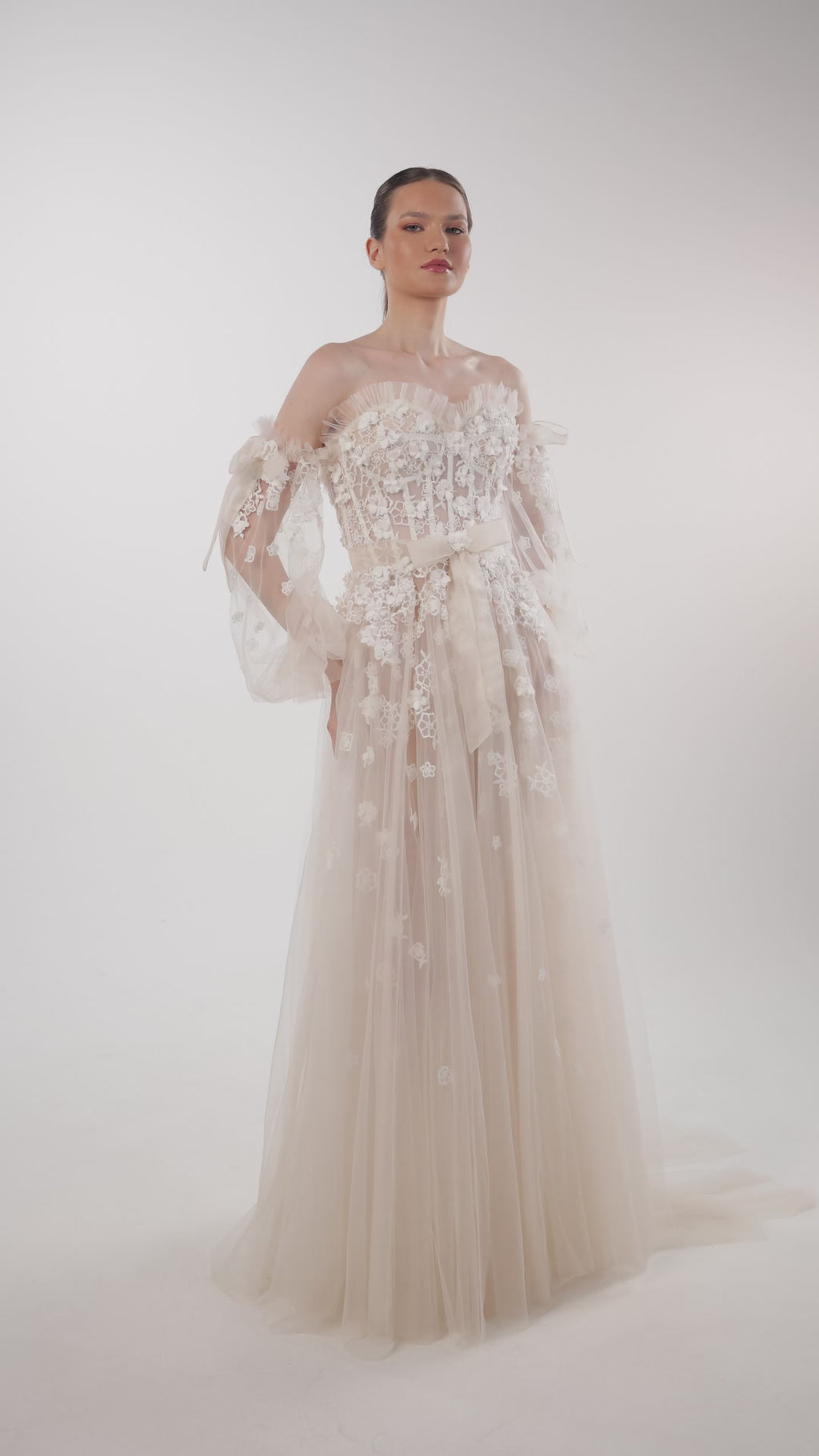 Off-shoulder embroidered tulle gown with detachable puffy sleeves, 3D floral details, and an organza belt with 3D flower knot.