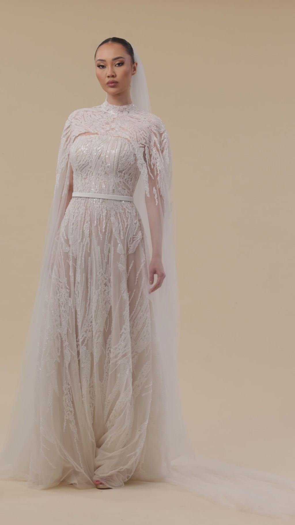 A strapless fully embroidered A-line gown accented with a soft belt and styled with a high-neck embroidered cape.