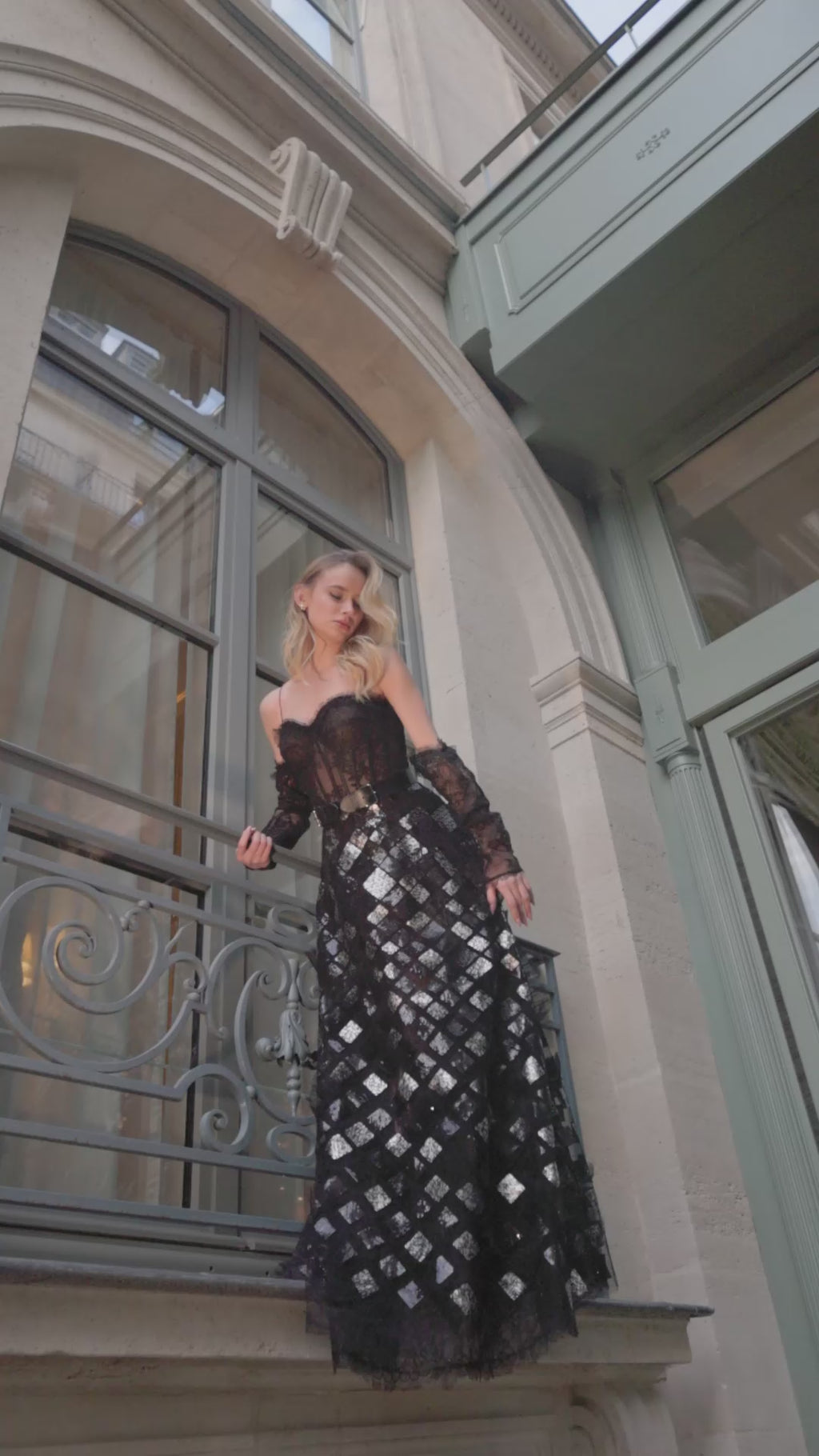 A romantic sweetheart lace gown adorned with ruffled tulle, intricate embroidery, and elegant lace sleeves, cinched with a bold statement leather belt.