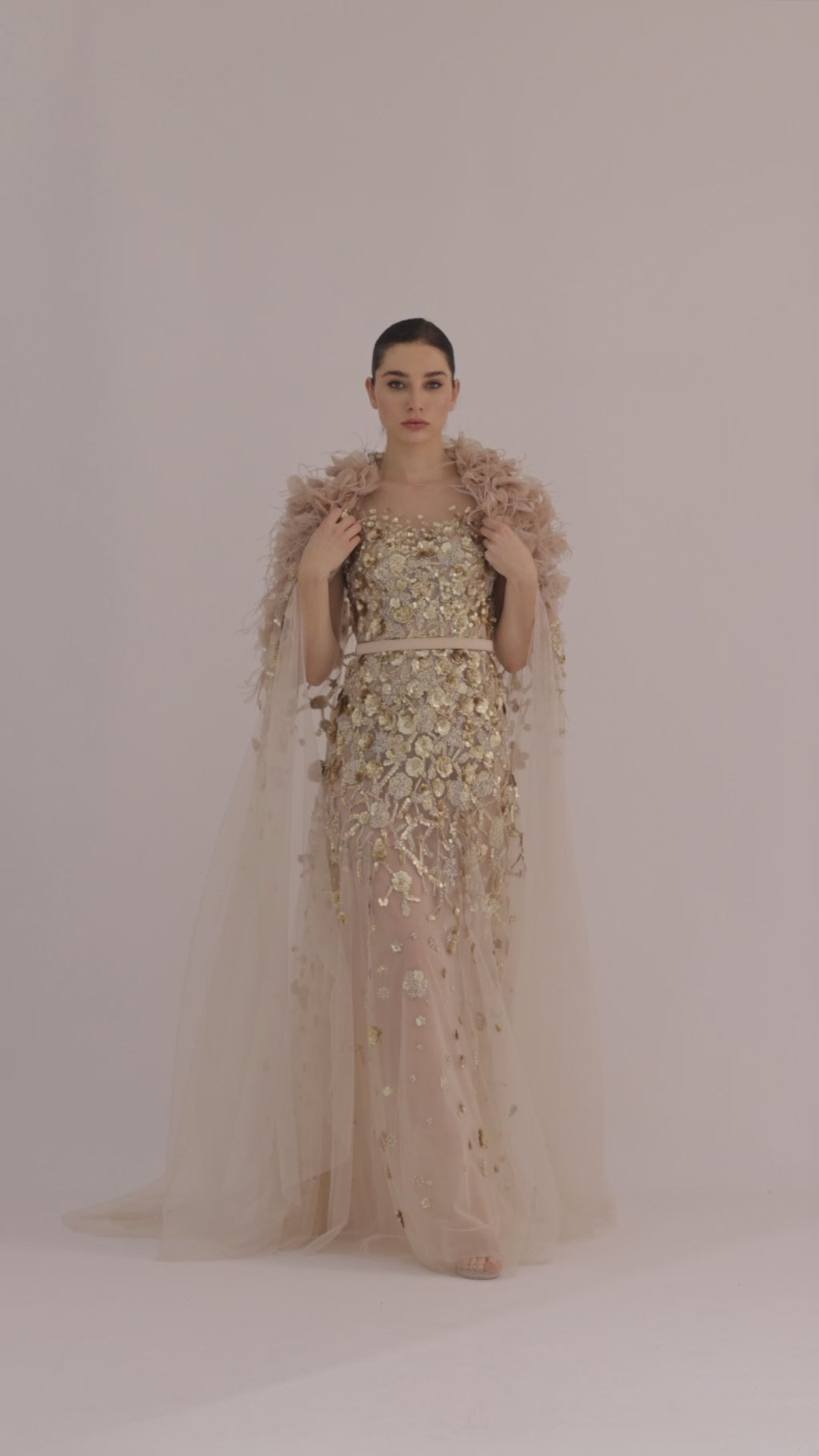 A nude tulle gown featuring intricate gold embroidery and delicate 3D floral appliqués, designed with a fitted silhouette and a detachable dramatic floral cape.
