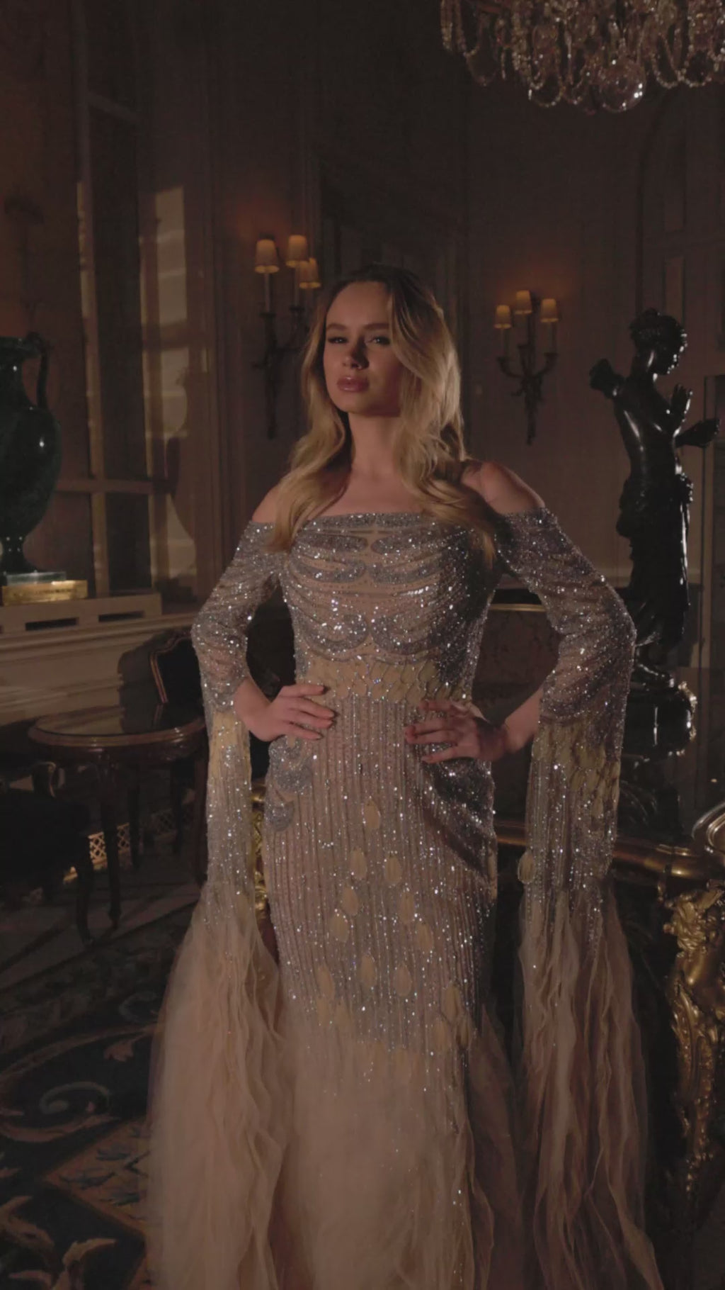 An off shoulder dress full hand embroidered with stunning details, ruffled tule bottom and dramatic extra long tule sleeves